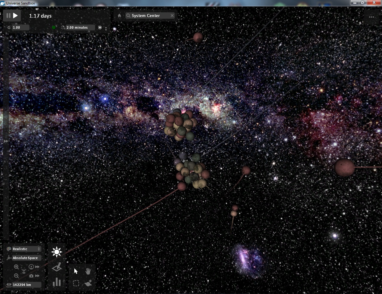 Название: Universe SandBox 2 Год выпуска: 2010 Жанр: Симуляторы, Песочница Разработчик: Dan Dixon Издательство: Dan Dixon Платформа: PC Версия: 2.0.14 Тип издания: Лицензия. Язык интерфейса: английский Язык озвучки: отсутствует/не требуется Таблэтка: Присутствует