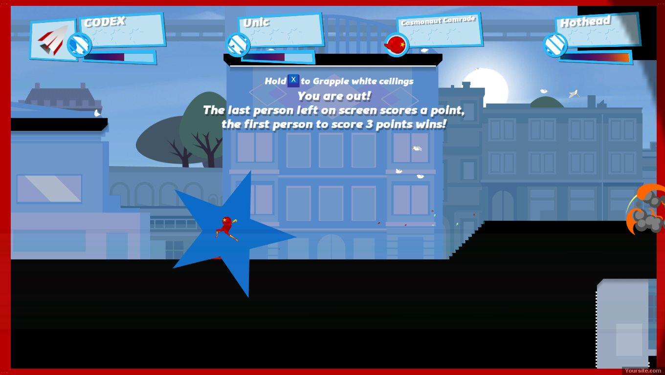 Особенности игры: Соревнуйтесь вчетвером онлайн или оффлайн! Догоните других игроков или вам суждено вылететь за экран! Используйте такие оружия, как ракеты, бомбы, крюки, чтобы помешать вашим друзьям и нажить врагов! Локальный и онлайн-мультиплеер! Два живых игрока против ботов? Почему бы и нет? Присутствуют боты - играйте сами, или с другими людьми! Присутствует обучение Поддерживает контроллер (рекомендуется!) Уникальные модификации! Единорог! Редактор уровенй и мастерская с тысячами уровней! 50+ игровых персонажей Полноценная система лиг - Режим локальной вечеринки, запускающий бесконечный матч - идеально для игры с дузьями!