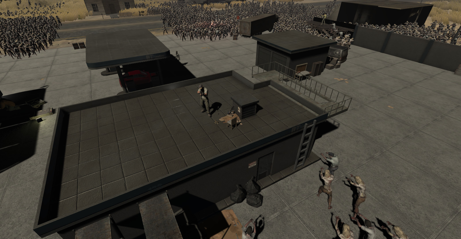 Проезжая через бесплодные пустоши, двигатель начинает барахлить. Вам удается добраться до заброшенной АЗС. К счастью, член вашей группы, механик Майк, может исправить двигатель и вернуть вас в путь. Но ему нужно время. Время, однако, может просто оказаться в дефиците, так как ваше прибытие на АЗС было зарегистрировано зомби. Ваша цель продержаться определенное время, что бы механик успел отремонтировать двигатель.