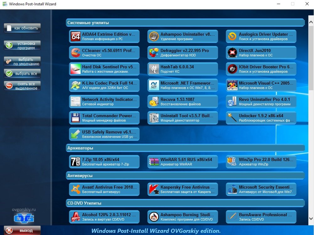 Особенности:В пакете WPI by OVGorskiy вы найдете утилиты для выполнения всевозможных задач. В главном сборнике имеется удобное меню, в котором все утилиты распределены по категориям, для того, чтобы вы могли мгновенно найти необходимую программу. Сборник имеет образ ISO диска, который вы просто распаковываете на своем устройстве, при этом вам не стоит устанавливать все сразу. Вы можете запускать образ диска только по необходимости, и инсталлировать то, что требуется в данный момент. Это могут быть архиваторы, антивирусы, системные утилиты, разнообразные интернет приложения, программы для CD/DVD, редакторы графики, аудио и видео, текстовые приложения, огромное количество проигрывателей, а также множество других утилит. Стоит также отметить, что все программы в сборке имеют краткое описание.