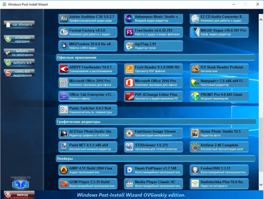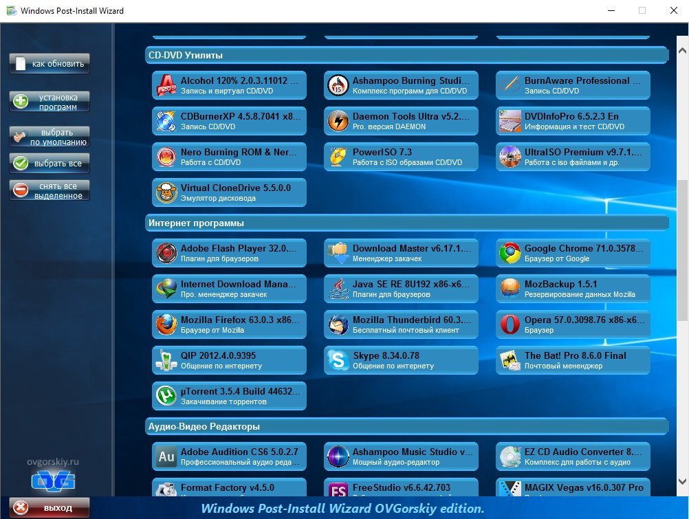 Не требуетсяОписание: Встречайте универсальный сборник программ, который должен быть у каждого пользователя, ведь для этого достаточно WPI Ovgorskiy скачать торрент на нашем интернет портале. Что же в нем интересного? Данный сборник состоит из программ и приложений на любой случай жизни, чтобы вы не захотели сделать на ПК, ноутбуке или в браузере.
