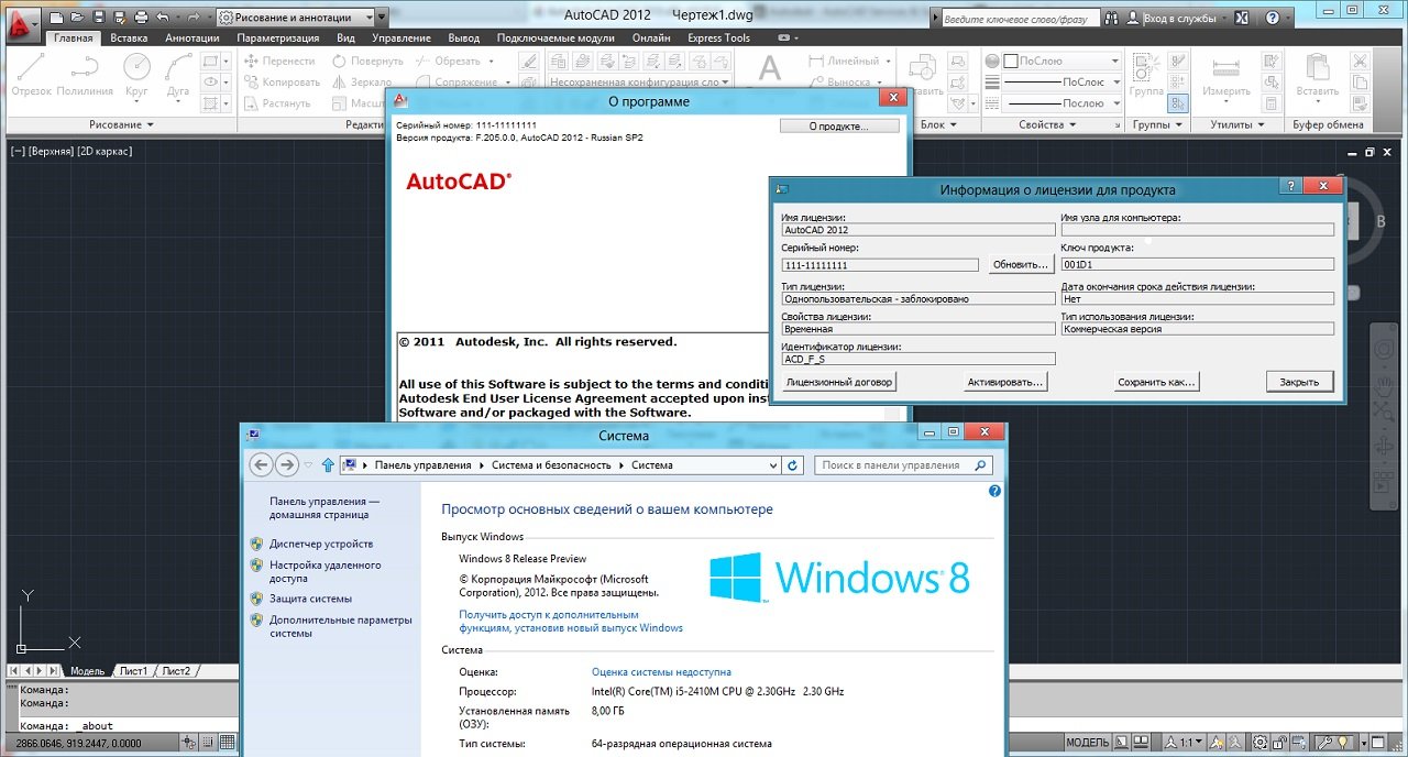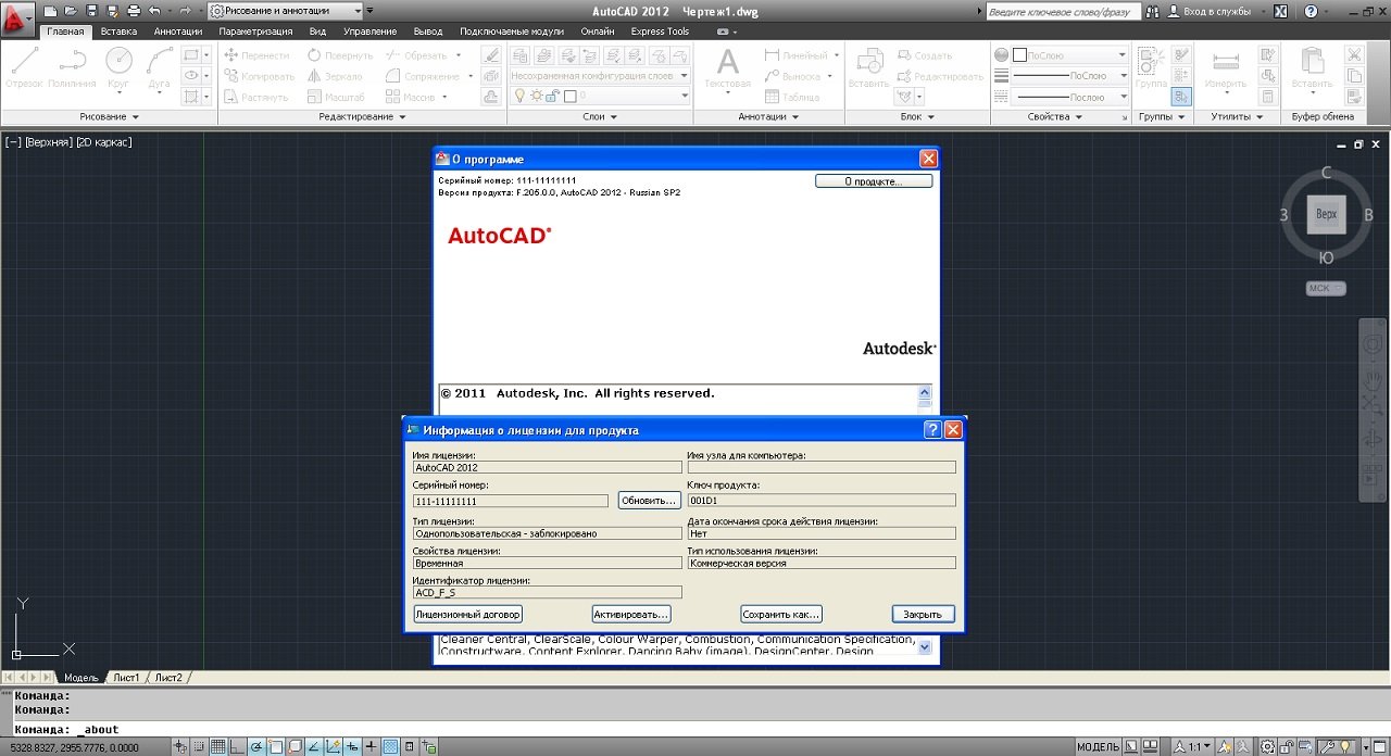 Установка1. Запустите установку AutoCAD 2012 используя 111-11111111, 222-22222222 или 333-33333333 в качестве серийного номера, и 001D1 в качестве кода продукта.