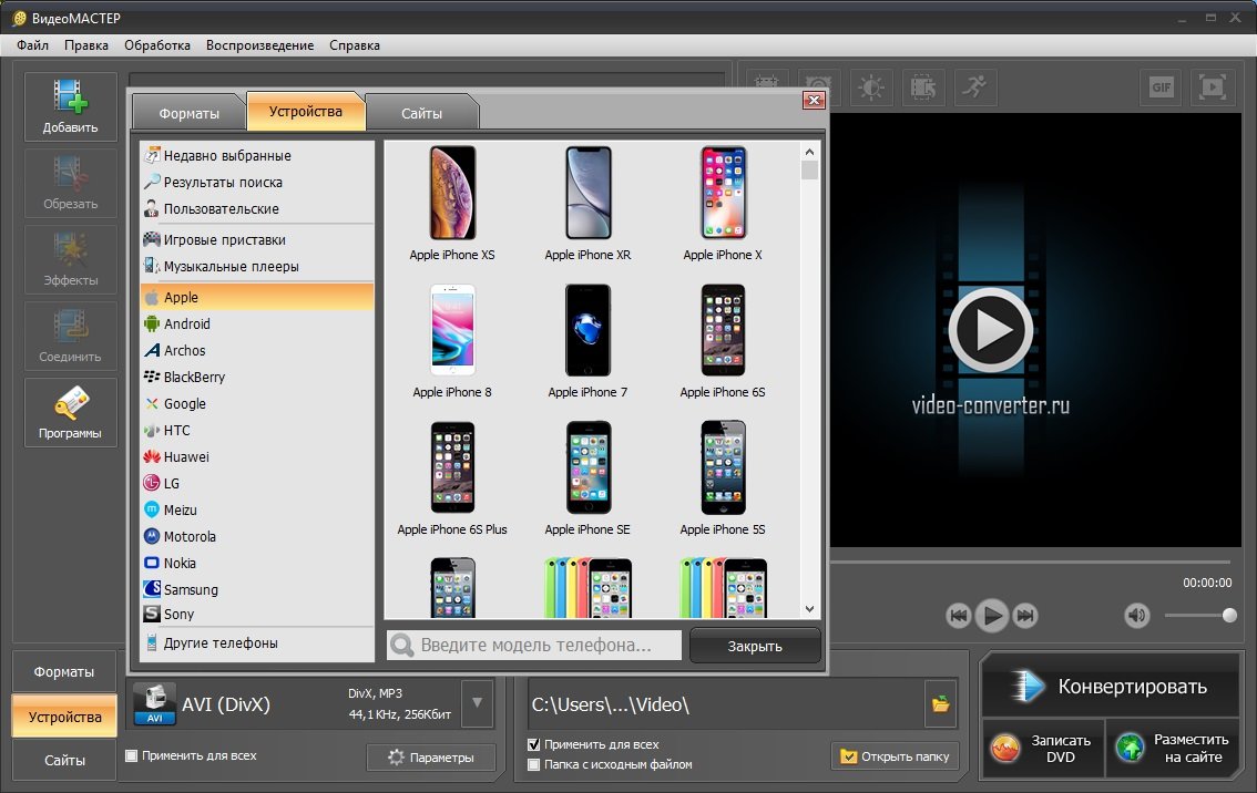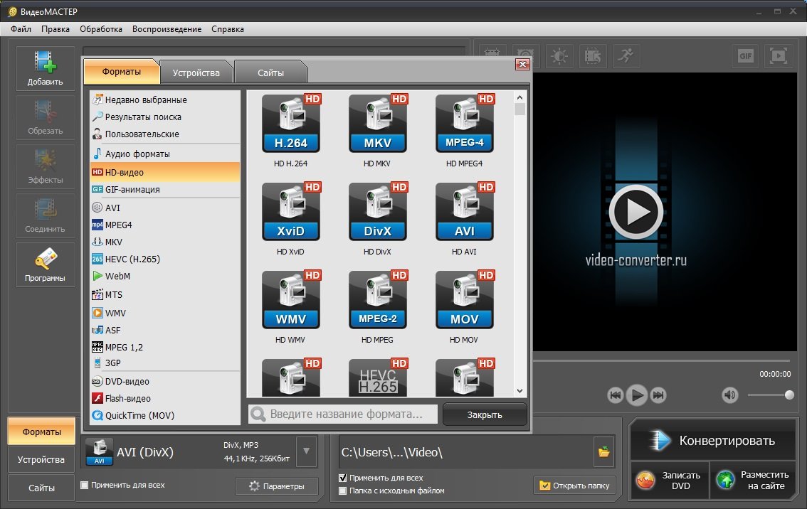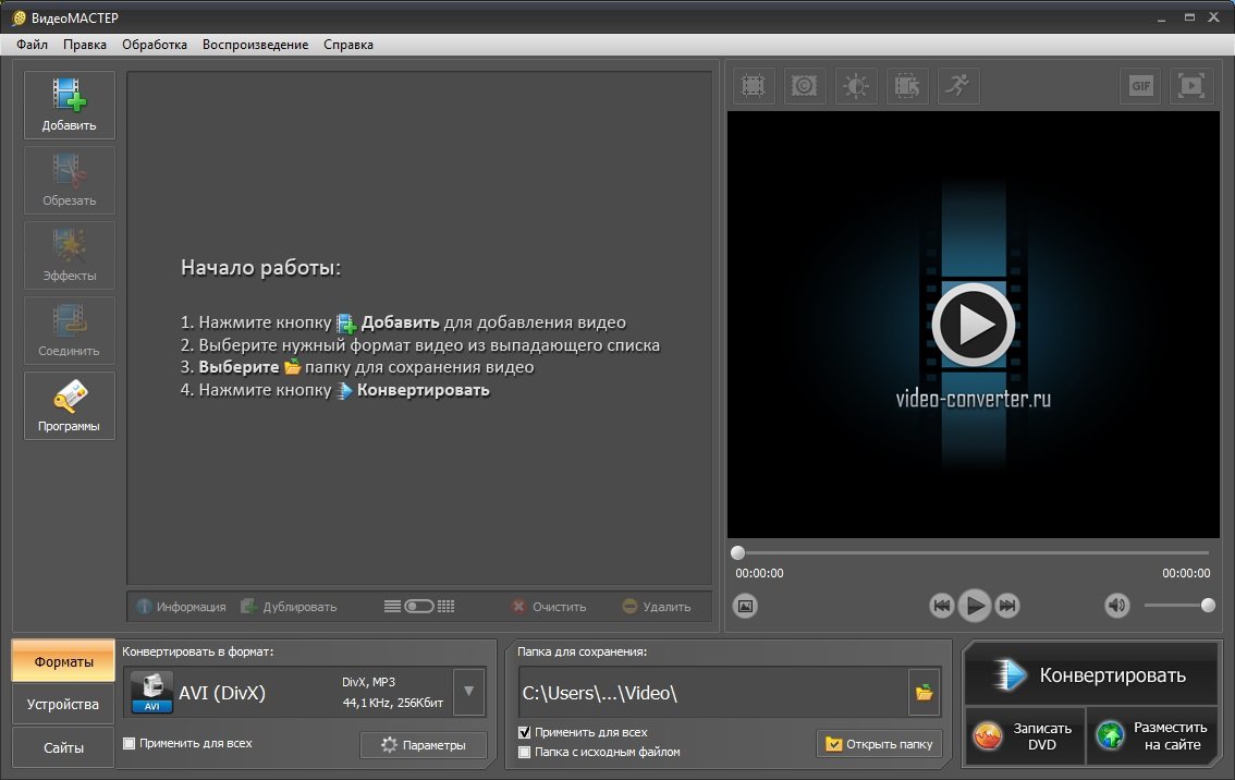 Не требуетсяВидеоМАСТЕР - универсальный видео конвертер с возможностью записи DVD дисков. Программа позволяет быстро конвертировать видео в любой формат, включая ролики высокого разрешения и онлайн-видео. Конвертер включает более 320 готовых настроек видео для мобильных устройств (плееров, телефонов, игровых приставок) и популярных сайтов, таких как YouTube, Vimeo, ВКонтакте и др. Кроме того, вы можете легко поменять любые параметры видео, включая разрешение и битрейт. Благодаря доступному интерфейсу на русском языке освоить программу можно всего за несколько минут! ВидеоМАСТЕР поддерживает форматы AVI, MP4, MPEG, 3GP, 3G2, WMV, MOV, VOB, MKV, FLV, MPG, PSP, M4V, MTV, H261, H263, H264, MP3 и многие другие, а также позволяет извлекать звук из любого видео.