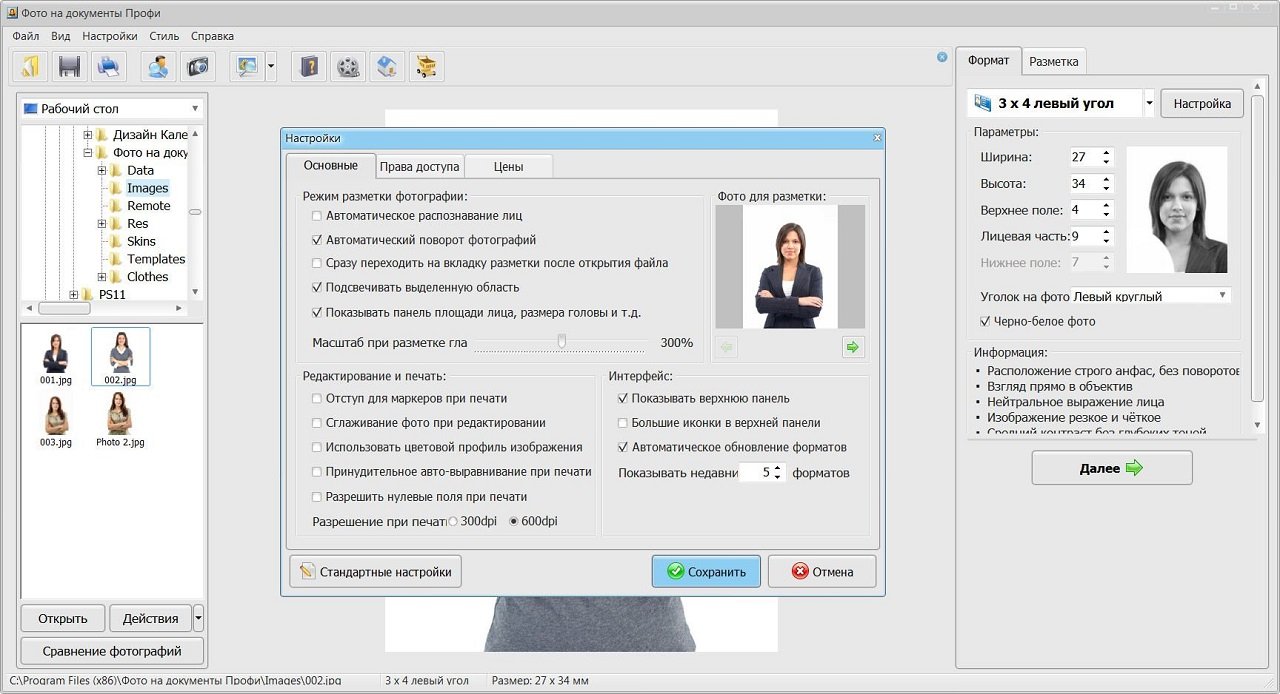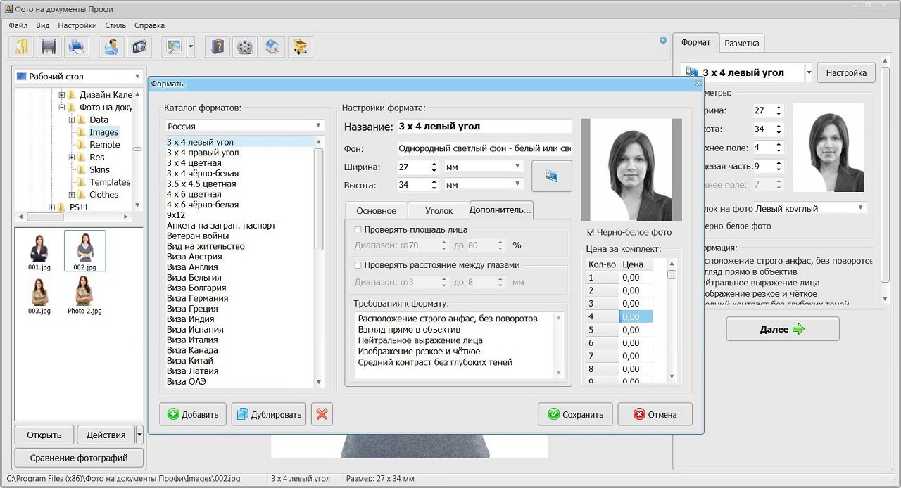 Особенности:Вы сможете загружать своё фото, подбирать нужный вам шаблон документа, редактировать изображение, ретушировать мелкие недостатки внешности, выбирать нужное количество фото для печати и даже менять костюм, используя представленный в программе каталог с большим выбором женской и мужской одежды. Закончив работу над своей фотографией, вы сможете начать печать на любом типе и формате бумаги, не выходя из приложения. Программа довольно простая, но если вдруг у вас возникнут какие-либо вопросы или затруднения в работе, то всегда можно изучить руководство по использованию, которое, к тому же, поможет вам сделать ваше фото на необходимый документ правильно и качественно.