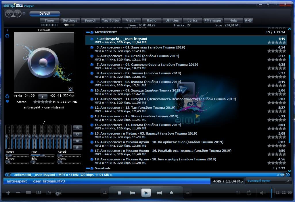 Особенности:Плеер запускается очень быстро, и не несет никакой нагрузки на систему вашего персонального компьютера. Однако, несмотря на это, AIMP (АИМП) имеет серьезные возможности, а именно перекодировка музыки, меняя форматы, запись звуков с микрофона, редактирование тегов аудиофайлов, сортировка аудиозаписей. Программа также поддерживает многопользовательский режим, который позволяет индивидуально настраивать оболочку плеера и списки прослушивания, поддерживает всех популярных, так и более редких форматов записей. Помимо этого, приложение обладает приятной вспомогательной функциональностью, такой как будильник и таймер сна.
