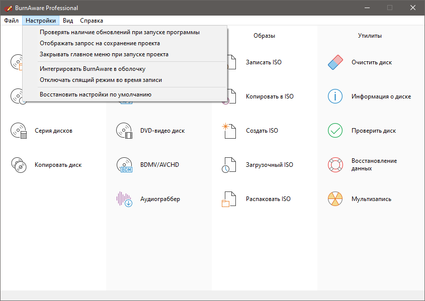 Не требуетсяBurnAware - простая и в тоже время мощная программа для записи и копирования любых дисков - CD, DVD, Blu-Ray и HD-DVD, а также копирования CD и DVD. Программа позволяет выполнять все основные задачи по записи: работа с носителями CD/DVD, Blu-Ray; запись Audio CD и DVD-Video; копирование и прожиг образов; клонирование дисков; поддержка мультисессии, также имеет дополнительные инструменты для созданий копий CD и DVD с фотографиями, документами, фильмами, играми и музыкой и многое другое. Имеется многоязычный интерфейс, включая русский и поддержка Windows 7.