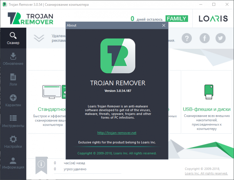 Не требуется (инсталлятор уже пролечен)Loaris Trojan Remover - мощное решение для удаления вредоносного ПО, среди которых есть троянские программы, интернет-черви, рекламные и шпионские программы. Утилита предназначена для удаления угроз с вашего компьютера, когда постоянная антивирусная защита не в состоянии обнаружить или полностью удалить их. Очень часто антивирусные решения хороши в обнаружении вредоносных программ, но не всегда справляются с их удалением.