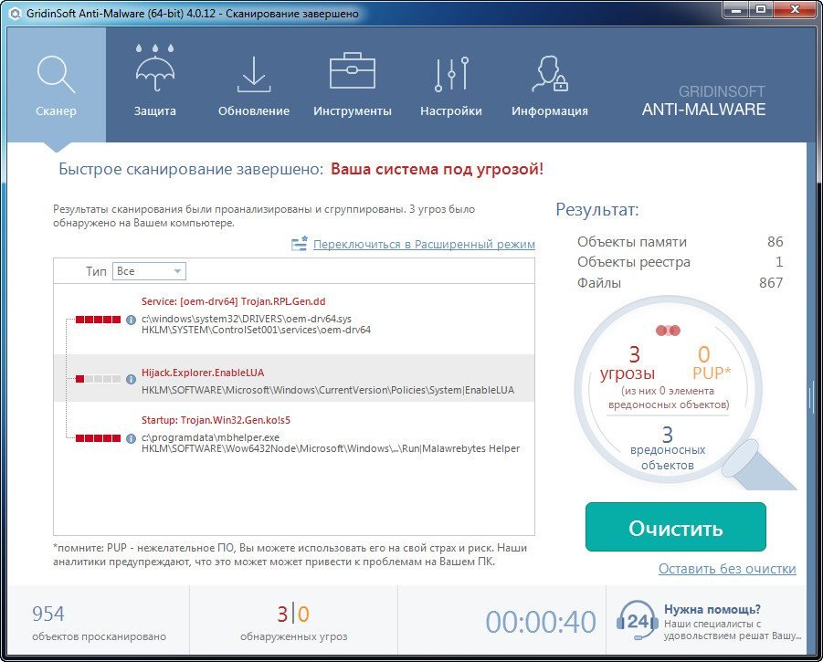 Не требуется (инсталлятор уже пролечен)GridinSoft Anti-Malware (ранее Trojan Killer) - антивирусная утилита, разработанная специально для отключения / удаления вредоносных программ без необходимости вручную редактировать системные файлы или реестр. Она удаляет дополнительные системные изменения, которые осуществляют некоторые вредоносные программы, и которые игнорируются некоторыми стандартными антивирусными сканерами. Если вы активный интернет-пользователь, то необходимо принять меры для защиты личной информации от возможных кибер-атак. GridinSoft Anti-Malware поможет вам своевременно выявлять и безопасно удалять опасные приложения.