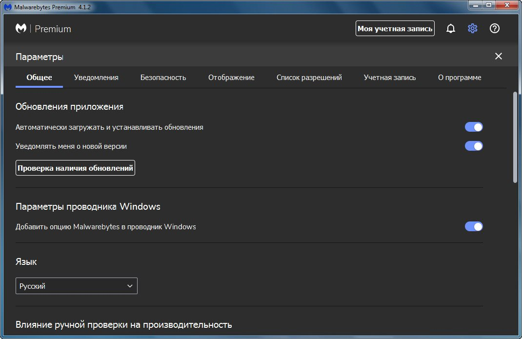• Дополнительные параметры. Настройка поведения защиты Malwarebytes Premium для опытных пользователей.