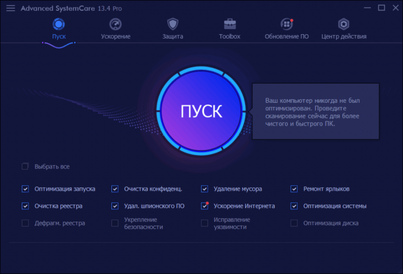 Особенности:Advanced SystemCare Pro поддерживает наивысшую производительность компьютера. Он может полностью оптимизировать Windows, обеспечивая исключительную производительность системы и высокую скорость Интернет, благодаря высвобождению собственной мощности системы, в зависимости от характера вашей работы с ПК. Программа превращает ваш персональный компьютер в настоящую бизнес-машину, производительную рабочую станцию, центр развлечений, игровую машину и научный вычислительный центр.