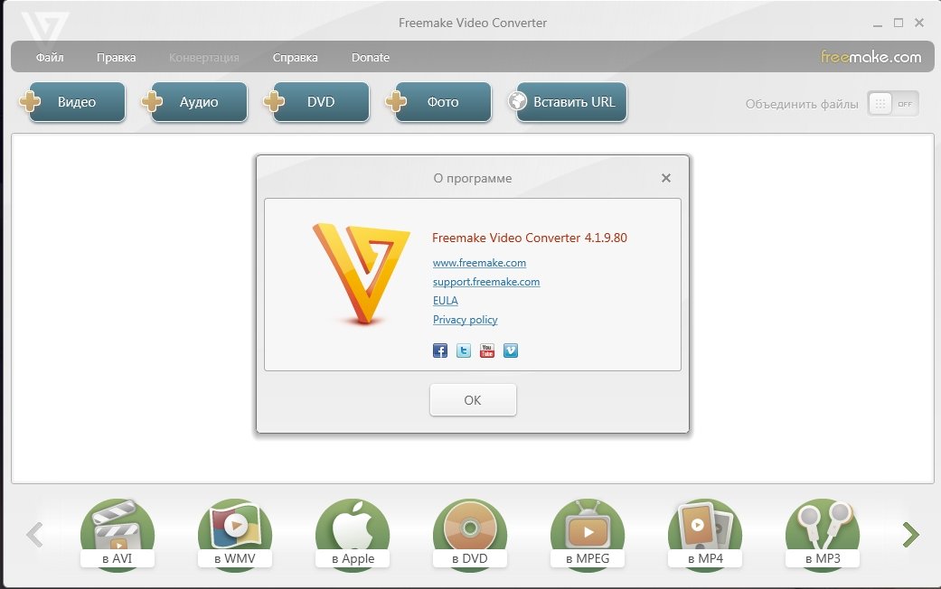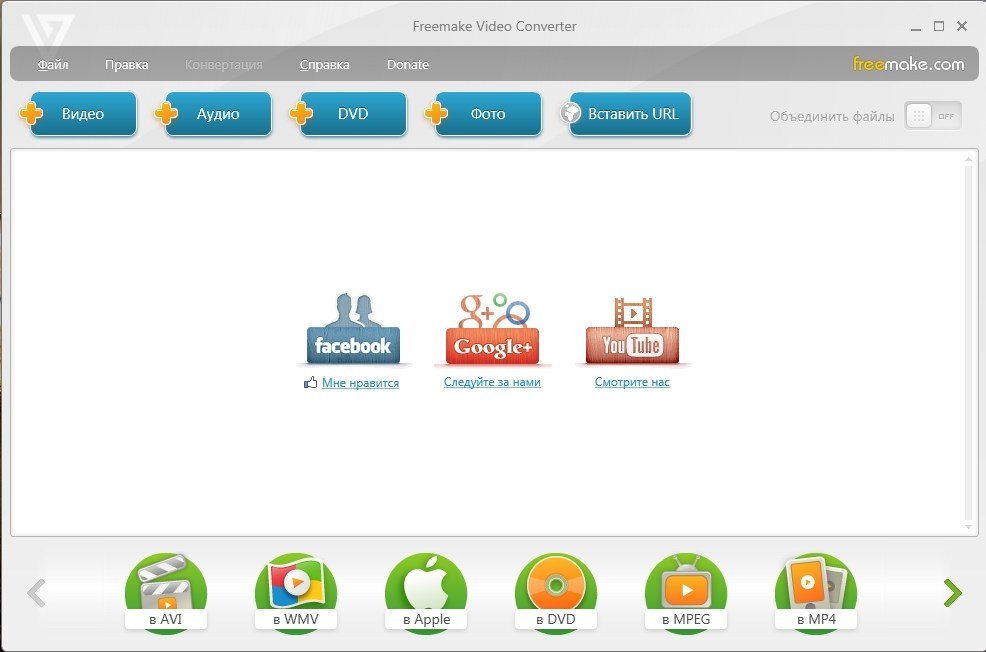 Не требуетсяFreemake Video Converter – бесплатная программа для быстрого конвертирования видеофайлов в распространенные форматы, их редактирования и записи на оптические носители. Предусмотрены возможности подготавливать файлы для просмотра на мобильных устройствах, создавать слайд-шоу и извлекать звук из видеофайлов.Freemake Video Converter - видео конвертер с закрытым исходным кодом для Microsoft Windows с предустановленным .NET Framework, разработанный «Ellora Assets Corporation». Утилита предназначена для конвертирования видео между форматами, прожига и риппинга DVD, прожига Blu-ray, создания слайд-шоу фотографий и музыкальных визуализаций, конвертирования онлайн-видео и загрузки файлов на YouTube.Freemake Video Converter может импортировать большинство популярных видео/аудио/графических форматов, и выводить их в AVI, MP4, WMV, Matroska, SWF, 3GP, DVD, Blu-Ray, MP3, осуществить видео поддержку для различных мультимедийных устройств, таких как IPod, iPhone, IPad, Xbox, Sony PlayStation, Blackberry, Android и других. Конвертер способен выполнить DVD прожиг, конвертирование видео/фотографий/музыки в DVD-видео.Freemake Video Converter предоставляет простые задачи для редактирования видео, такие как резка, поворот, переворот, объединение нескольких видео фрагментов в один файл, а также создавать слайд-шоу фотографий с сопровождающейся музыкой. Пользователи имеют возможность загружать созданные файлы с помощью Freemake Video Converter на YouTube.