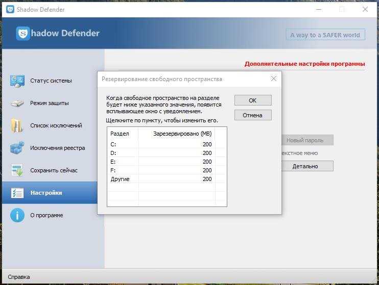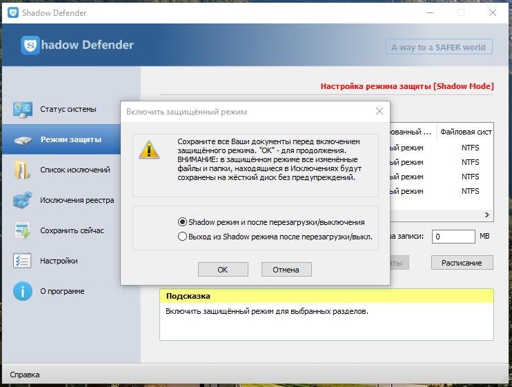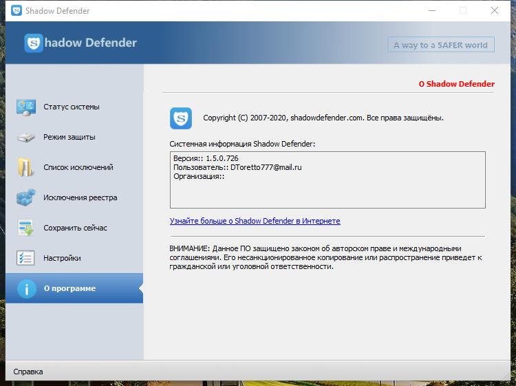 Не требуется (инсталлятор уже пролечен) Тип лекарства: кейгенShadow Defender - это новый аналог программы, подобной ShadowUser, позволяющей поставить систему в режим тени - Shadow mode, при котором вам не грозят ни удаление важной информации, ни атака вирусов. Эта утилита так же служит для обеспечения защиты компьютера и конфиденциальности информации. Предотвращает нежелательные и злонамеренные изменения в вашем компьютере, позволяет загружаться в виртуальном теневом режиме с выборочным сохранением данных, проста в обращении.
