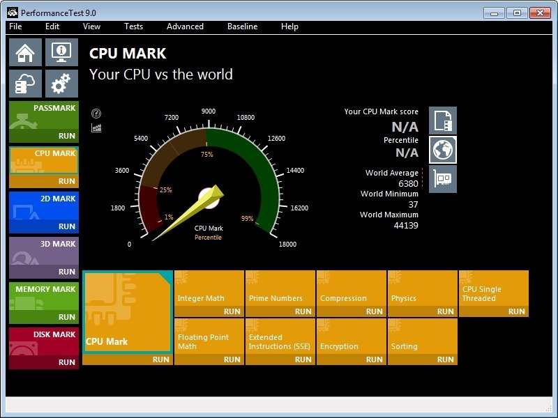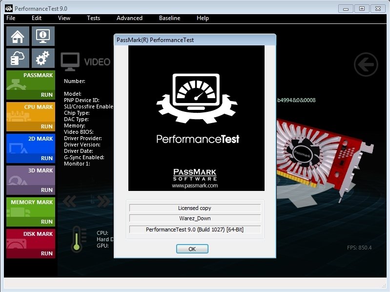 Не требуется (инсталлятор уже пролечен)PassMark PerformanceTest - набор тестов, позволяющих оценить общую производительность вашего ПК по сравнению с другими компьютерами. В программу входят двадцать семь стандартных тестов в семи группах, плюс еще пять для пользовательских тестов. Среди стандартных можно отметить тесты процессоров, 2D и 3D графики, дисковых накопителей, памяти, CD/DVD-приводов и многих других составляющих компьютера.Passmark PerformanceTest - программа эталонного тестирования аппаратных средств компьютера, которая обеспечивает быструю оценку работы "железа" (поддерживаются как однопроцессорные, так и многопроцессорные системы). Результаты тестирования представляются в виде гистограммы, что позволяет быстро сравнить полученные результаты с множеством базовых компьютерных систем.Комплексный тест производительности системы PerformanceTest от PassMark Software можно охарактеризовать большим набором тестовых модулей и неплохой визуализацией сравнительных результатов, что интересно, компания Intel поставляет его в комплекте с фирменного ПО материнских плат собственного производства.