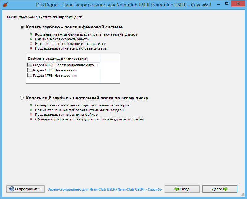 В комплекте [Блокировать выход в сеть - фаерволом (Брандмауэром)] Тип лекарства: KeyGen-URETDiskDigger - это программа для восстановления случайно удаленных данных с носителя, а также для восстановления поврежденных файлов и папок в результате вирусной атаки. Программа выполняет сканирование носителя и анализирует структуру данных, которые система считает удаленными. Используя собственную методику восстановления данных, программа может реанимировать потерянные файлы (видео, фотографии, музыку, документы и пр.), но только в том случае, если информация не была еще перезаписана. DiskDigger может восстанавливать данные с любых носителей - карт памяти SD, CompactFlash и Memory Stick, USB-накопителей, внешних и внутренних жестких дисков.