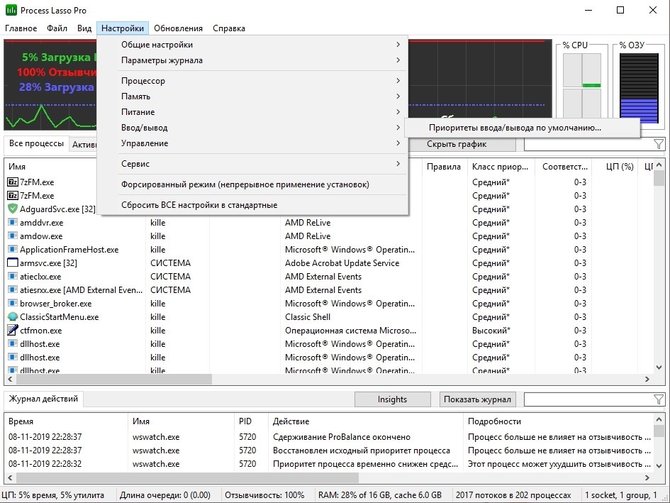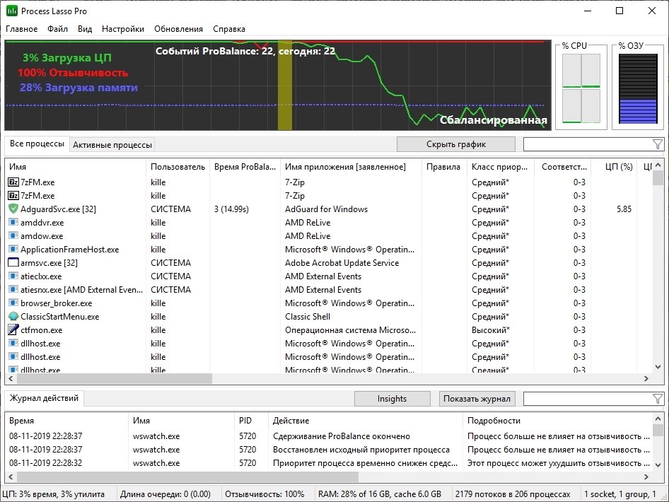 Не требуется (инсталлятор уже пролечен)Process Lasso позволяет вручную или автоматически манипулировать запущенными на компьютере процессами, что позволяет добиться максимального быстродействия и стабильности системы. Process Lasso наблюдает за программами, активно загружающими центральный процессор и ограничивает их, тем самым улучшая системный отклик. Также она может автоматически снизить приоритет для процесса, применив заданные по умолчанию значения. Windows, по умолчанию, позволяет программам полностью загружать центральный процессор, что ведёт к зависанию системы и, соответственно, к неудобству работы. Технология ProBalance (Process Balance) программы Process Lasso аккуратно перераспределяет приоритеты запущенных программ, так что процессы, которые ранее загружали весь центральный процессор, больше не будут влиять на отклик системы.