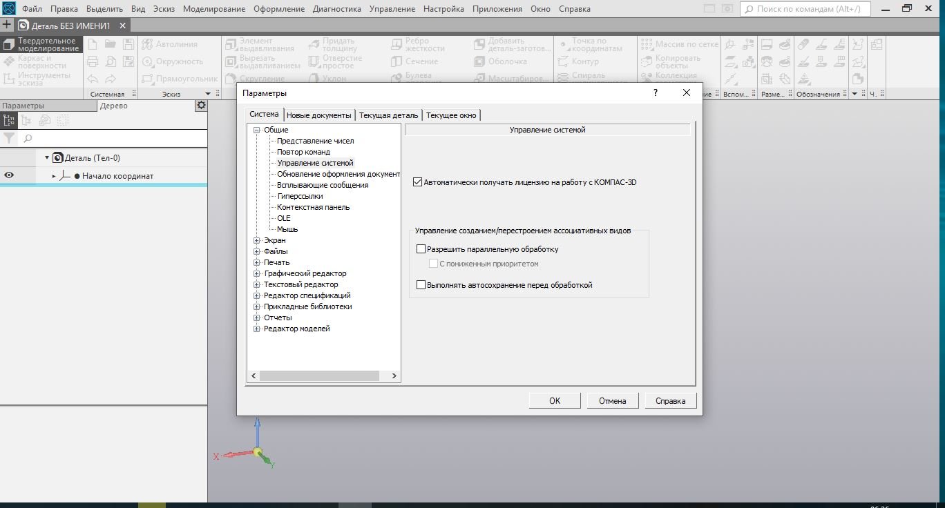 5. При первом запуске программы зайти в "Настройка" -> "Параметры" -> вкладка "Система" -> "Общие" -> "Управление системой" и поставить галочку "Автоматически получать лицензию на работу в Компас 3D".