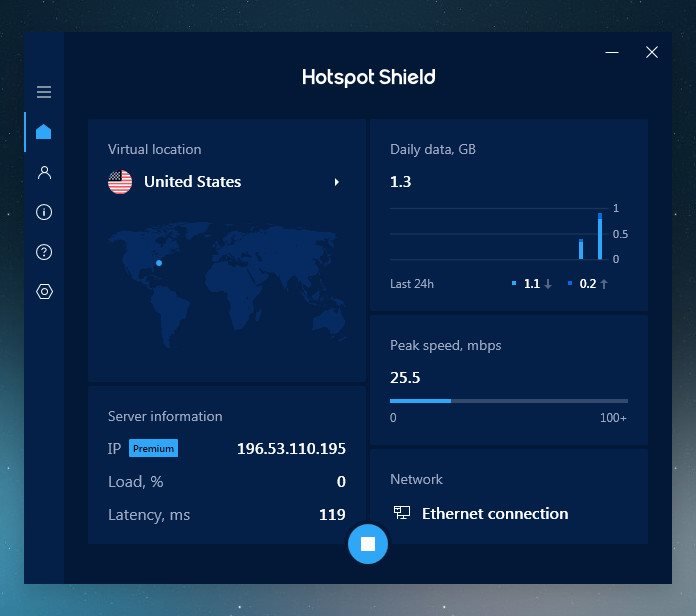 Hotspot Shield создаёт VPN (Virtual Private Network - виртуальная частная сеть) между вашим ноутбуком или телефоном и нашим шлюзом в Интернет. Этот безопасный тоннель не дает злоумышленникам, хакерам и провайдерам следить за просмотром веб-страниц, мгновенными сообщениями, загрузками, деталями кредитных карт и любыми другими данными, которые вы передаете или получаете по сети.