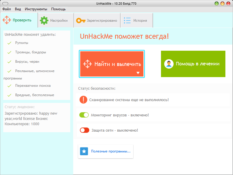 серийник (акция Comss)UnHackMe – самый эффективный убийца любых вредоносных программ. Это антируткит и антишпион в целом, который позволяет обнаруживать и удалять руткиты, перенаправления поиска в браузере, программы скрытия вредоносных следов, потенциально-нежелательные приложения и рекламное ПО, шпионские программы.