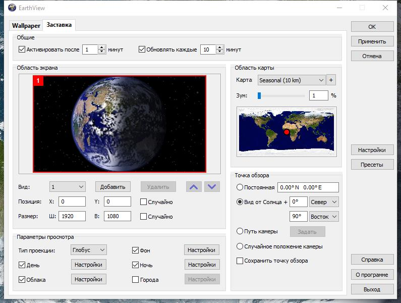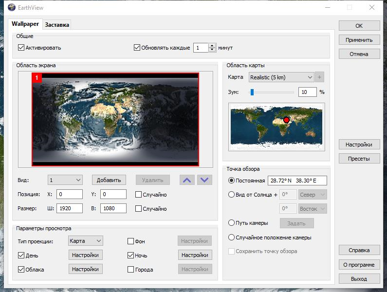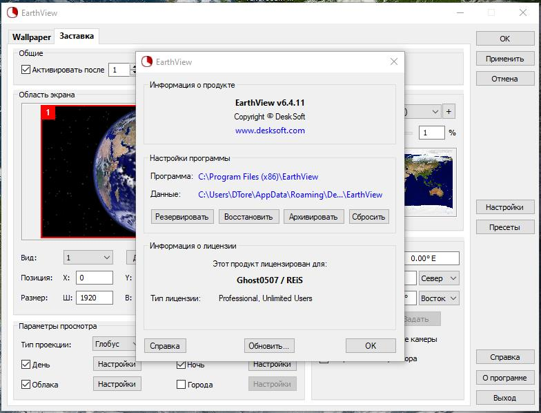 Не требуется (инсталлятор уже пролечен)EarthView - это динамические обои и скринсейвер в виде карты нашей планеты или глобуса вращающегося синхронно с оборотом земли (поддерживает смену дня/ночи, облака, огни городов).Приложение отличается высокой детализацией картинки и насыщенными цветами.Позволяет настроить качество изображения с учетом производительности вашего компьютера.Поддерживает возможность скачивания дополнительных фотореалистичных карт с сайта разработчика.