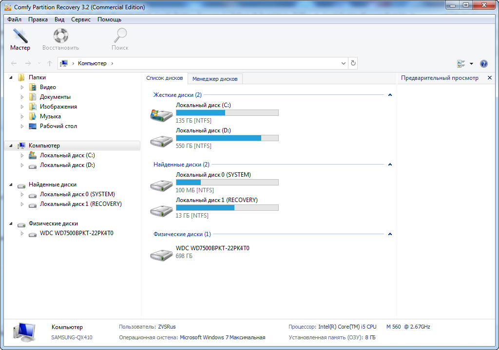 Не требуется (инсталлятор уже пролечен)Описание: Программа восстановит данные удаленные, как с рабочих, так и с поврежденных логических разделов.Comfy Partition Recovery предназначена для восстановления файлов, удаленных в результате любых мыслимых происшествий.Если ваши данные были утеряны после очистки корзины (Windows “Recycled Bin”), удалены без помещения в корзину “Shift” + “Del”, утеряны после форматирования диска, удаления раздела, ошибок файловых систем FAT, NTFS программа с легкостью восстановит ваши данные.Утилита анализирует содержимое жесткого диска и находит на нем файловые таблицы файловых систем FAT, NTFS (если основная копия файловой системы удалена, то программа использует ее копию).Используя эту информацию, программа позволяет восстановить не только содержимое удаленных файлов, но и всю служебную информацию – дерево папок, файловые атрибуты (имя, даты создания, редактирования, …).Программа использует низкоуровневый доступ к носителю информации, это позволяет восстанавливать информацию с недоступных, удаленных, битых дисков.Программа разработана с учетом всех требований безопасности.