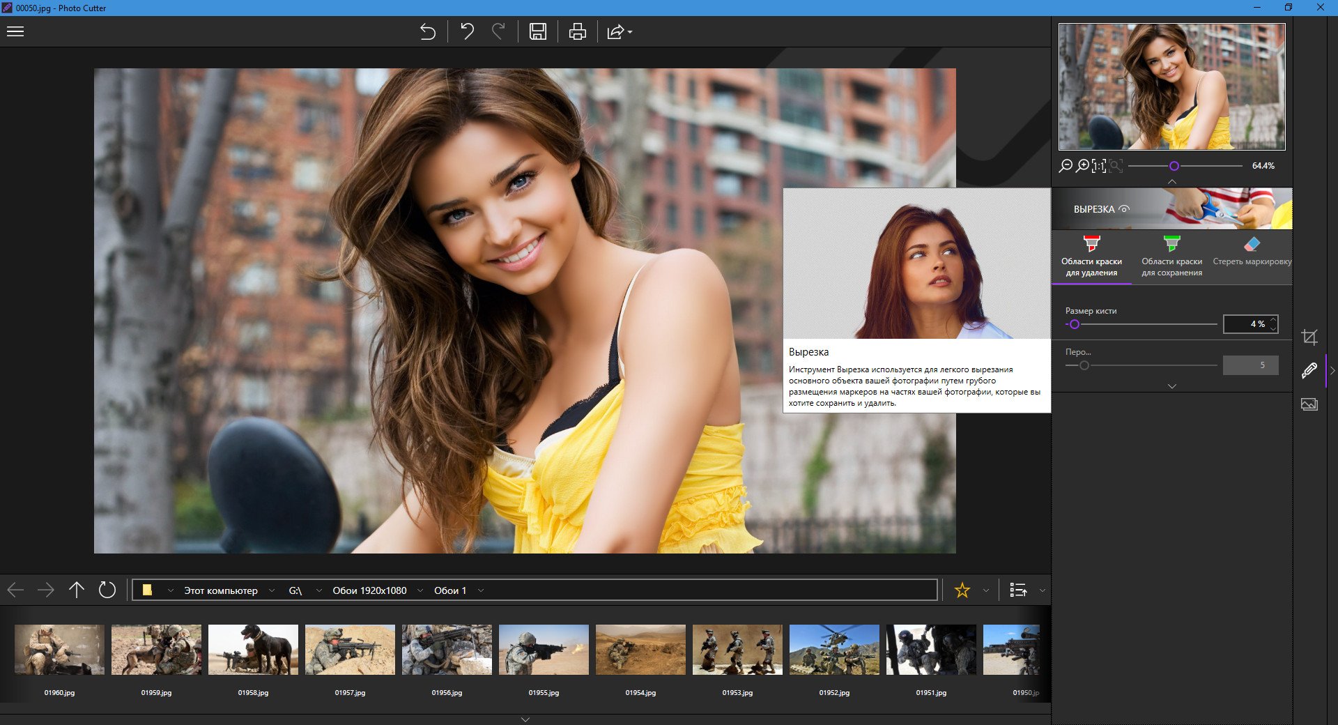 Не требуетсяPhoto Cutter — программа, при помощи которой вы сможете вырезать из фотографий любые детали, лица, объекты или пейзаж за несколько кликов. Благодаря курсору выберите объект или фон для удаления, а алгоритм Photo Cutter выполнит все автоматически. Даже тонкие детали, такие как волосы, могут быть удалены с удивительной точностью.Вы также можете использовать курсор «удержания» для сохранения важных деталей. Затем просто вставьте разрезанные объекты на любой фон, чтобы сделать коллажи или фотомонтаж всего одним щелчком мыши! А улучшенная функция сглаживания края позволяет вам разумно сглаживать контуры для более мягкого перехода между объектом и фоном, для еще более успешной интеграции в ваш фотомонтаж.