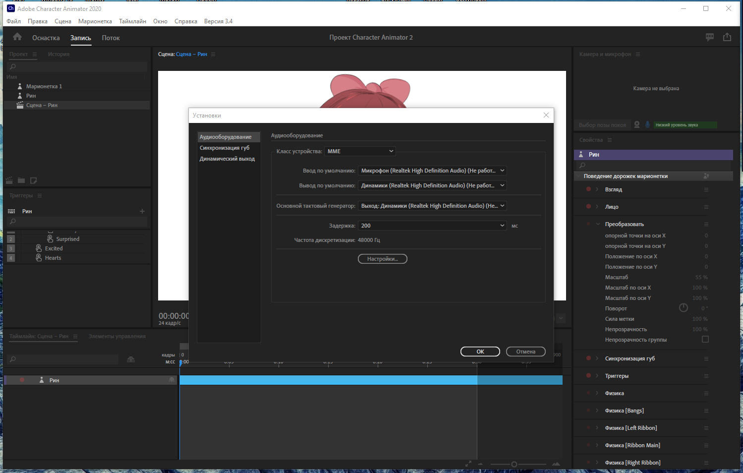 • Веб-камера (для отслеживания лица), Микрофон (для записи аудио и синхронизации губ), Наушники (для предотвращения перезаписи дублей уже записанного аудио при последующих дублях)