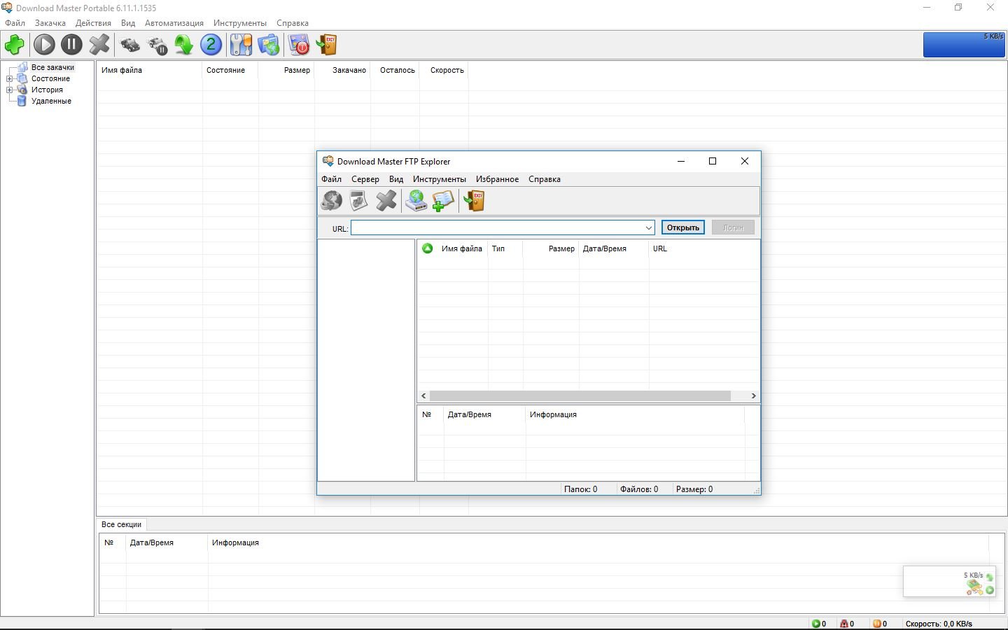 Не требуетсяDownload Master эффективно решает 3 главных проблемы, возникающих при закачке файлов из Интернет: скорость закачки, продолжение прерванных закачек и управление закачанными файлами. Основными чертами, выделяющими Download Master среди других программ, являются высочайшая эффективность работы и удобный пользовательский интерфейс. Download Master позволяет значительно повысить скорость закачки файлов через Интернет с использованием HTTP, HTTPS и FTP протоколов. Для этого используется разбиение файла на потоки, которые закачиваются одновременно. Программа также поддерживает докачку файла с текущей позиции после обрыва связи.