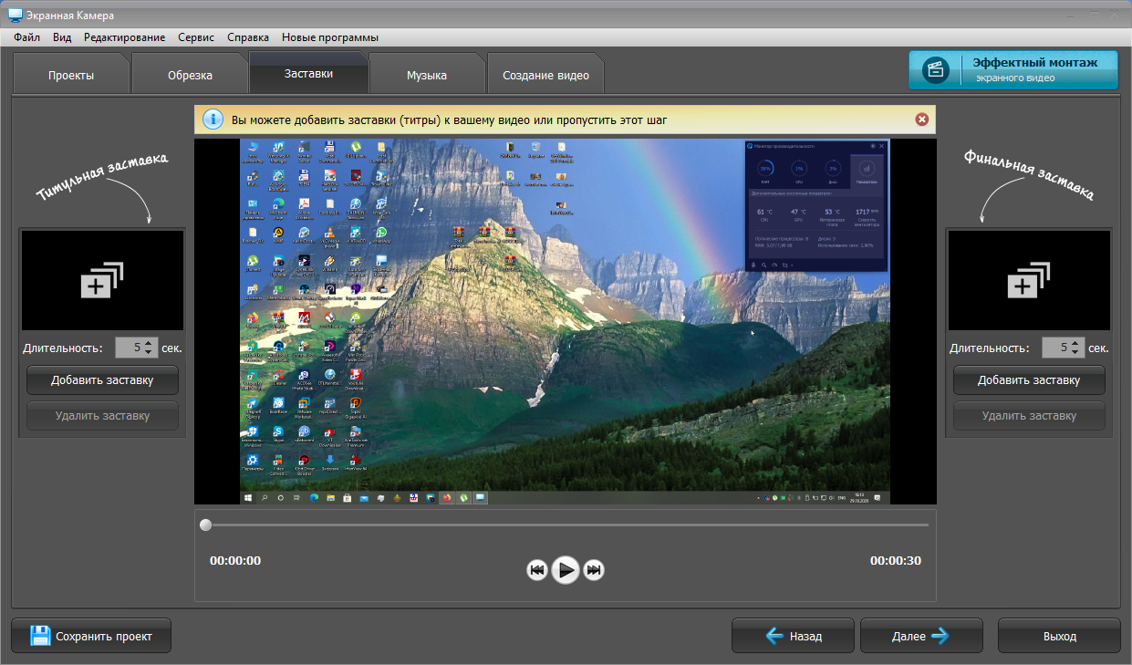 Программа включает десятки готовых оформлений для записанных скринкастов, в том числе яркие заставки, титры и музыку.