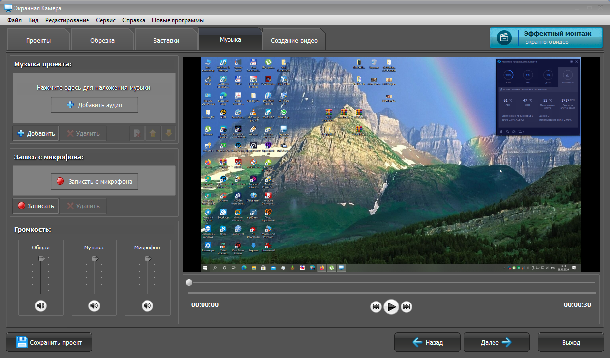 Не требуется (инсталлятор уже пролечен)Экранная Камера - новая программа для записи видео с экрана и подготовки собственных видеокурсов. Продукт позволяет быстро и качественно захватывать рабочий стол, программы, игры, онлайн-трансляции, вебинары, видеозвонки и многое другое.Конвертировать готовый проект можно в любой популярный видео формат, включая HD, а также записать на DVD и загрузить на YouTube. Отличительной особенностью «Экранной Камеры» является встроенная коллекция оригинальной музыки для озвучивания видеоуроков.А если вы хотите использовать свои аудио файлы, достаточно будет лишь выбрать их в нужной папке и загрузить в программу.Помимо музыкального сопровождения, получившееся видео можно оформить оригинальными заставками и титрами. Программа включает несколько десятков стильных шаблонов заставок, которые придадут вашему видео профессиональное оформление.