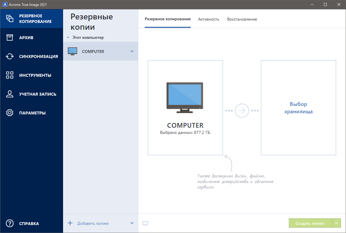 Переместите все данные ПК (операционную систему, программы, настройки, файлы и т. д.) на более объемный или быстрый диск. С помощью Acronis True Image 2019 можно клонировать активную систему Windows на локальный диск или внешний USB-накопитель без прерывания работы и перезагрузки.