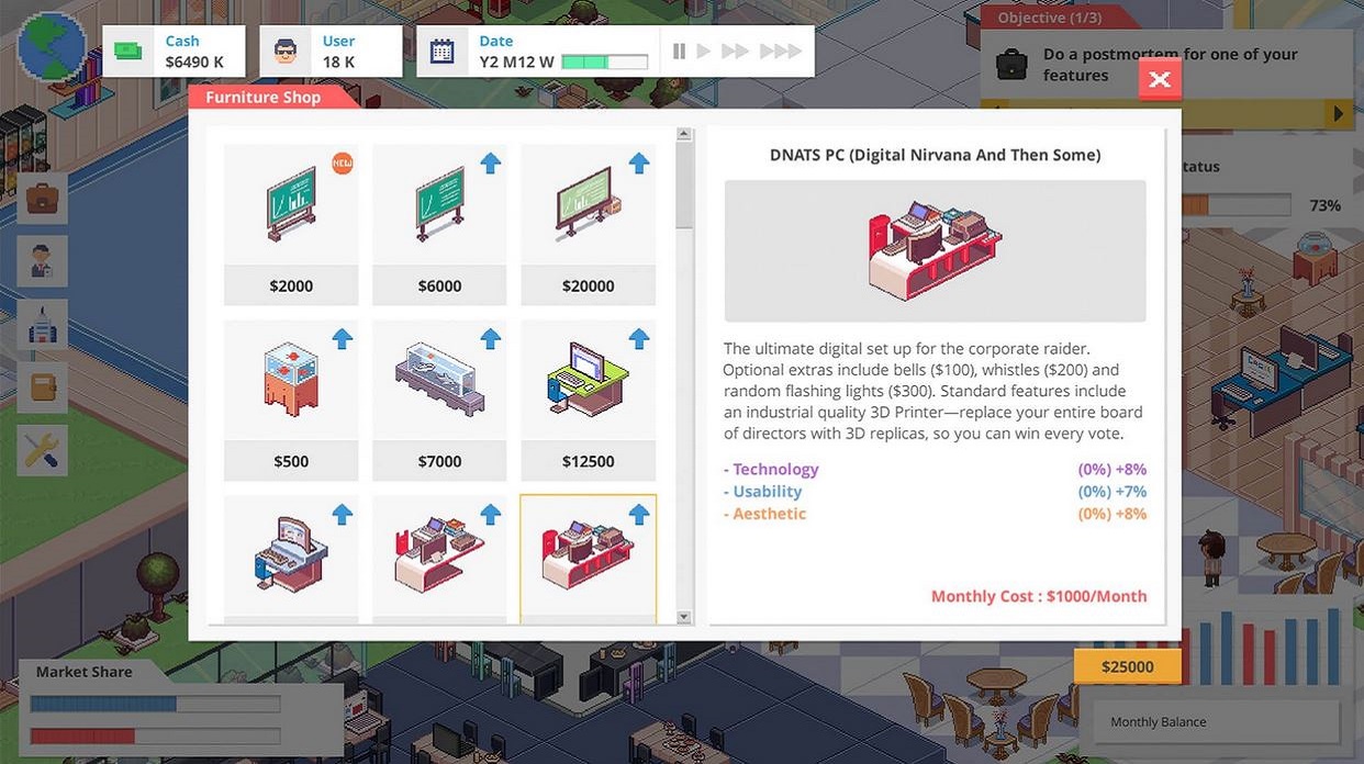 Но начинать вам придется с малого. Сначала вы будете простым рядовым работником обычной компании, но внезапно ваш герой решит начать свое дело, и вот тут-то и начнется все самое интересное. Но не стоит сразу хвататься за разработку программ – в первую очередь вам придется позаботиться о рабочем месте. Вы будете начинать работу с небольшой суммой денег и маленьким помещением, в котором не будет места, ни микроволновой печке, ни даже автомату с газировкой. Компьютер, рабочий стол и помещение размером в ванную комнату – вот ваше первое рабочее место.