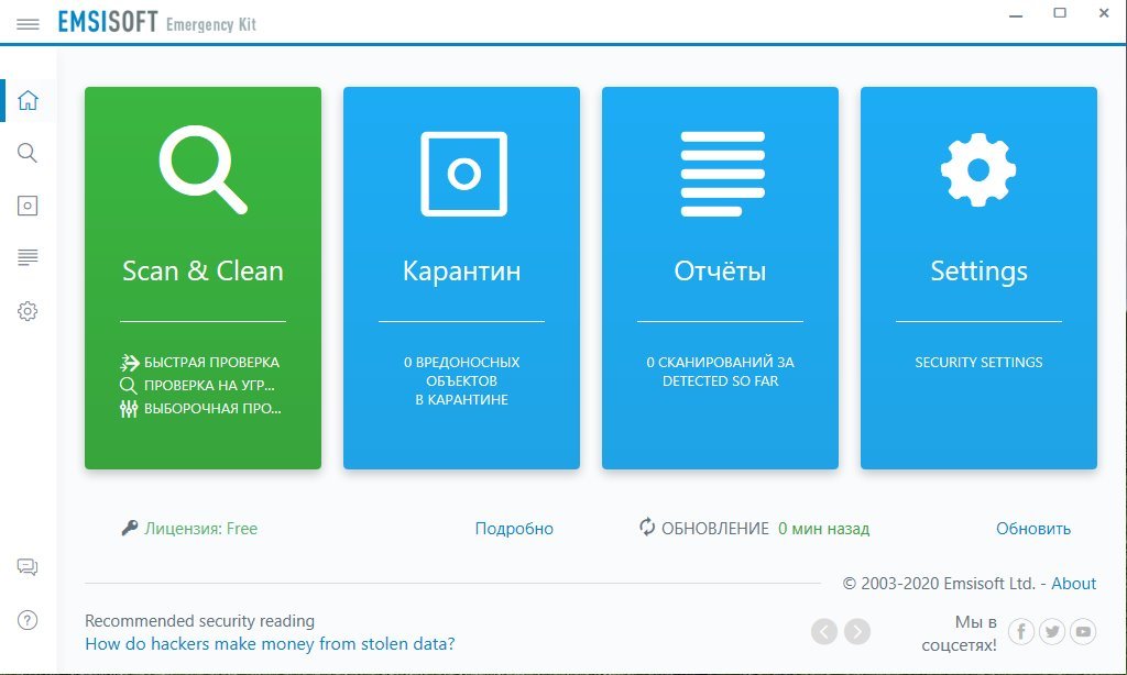 Не требуетсяEmsisoft Emergency Kit - бесплатный портативный комплект антивирусных программ, который может быть использован без установки и Интернета для сканирования с помощью движков Bitdefender и Emsisoft, а также лечения зараженного компьютера от вредоносного ПО, используя USB-флешку.