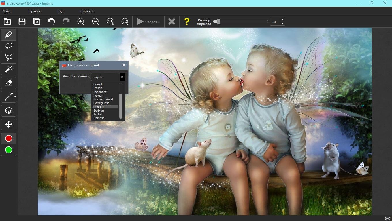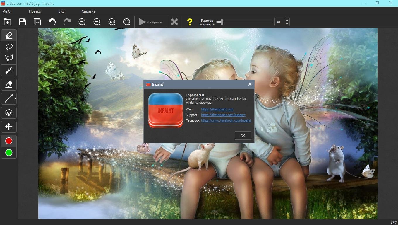 В комплекте (замена файлов)Inpaint - позволяет умно удалять нежелательные элементы на цифровой фотографии, такие как ненужные объекты, текст, случайно попавшие элементы, а также пыль, рекламу, мусор, царапины и грязь. Часто, скачивая из Интернет картинки, мы сталкиваемся с таким неприятным явлением, как наличие логотипов, водяных знаков и надписей. Что делать в таком случае? Не тратить же свое время на обработку, в общем то, не очень необходимой картинки. Тем более в таких тяжелых программах, как Photoshop. Но, все таки, хочется сохранить ее. В этом случае и поможет данная программа. Программа реконструирует фоновую поверхность. Вам необходимо только выделить объект и нажать всего лишь одну кнопку.