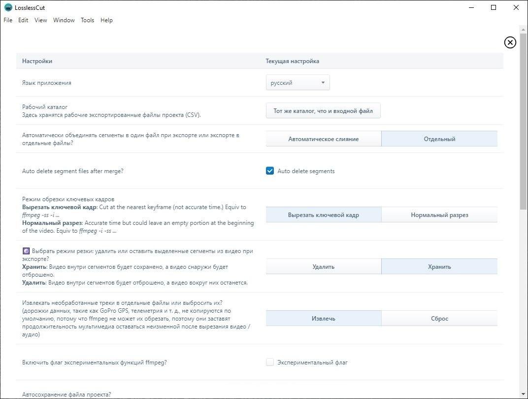 :Не требуетсяLosslessCut — простой видеоредактор для нарезки медиафайлов без потери качества. Не делает никакого декодирования/кодирования и поэтому работает чрезвычайно быстро. Вырезанный фрагмент мгновенно появляется рядом с исходником. Делает слияние выбранных сегментов и слияние произвольных файлов (с одинаковыми кодеками) без потерь. Извлекает без потерь видео, аудио и субтитры. Также, захватывает кадры в JPEG/PNG и режет аудиофайлы распространенных форматов.LosslessCut основан на Chromium и использует для воспроизведения видео/аудио HTML5 плеер, а для их нарезки используются возможности FFmpeg библиотек.Работает в оконном и полноэкранном режимах. Есть поддержка горячих клавиш.