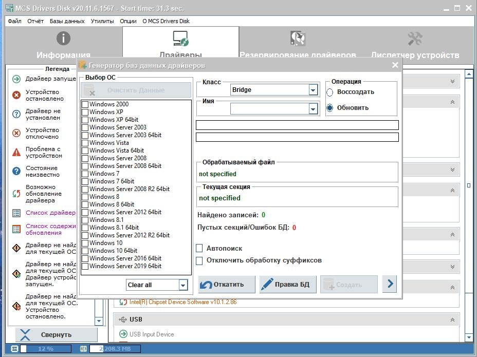 Особенности:Количество найденых программой драйверов для той или инной ОС зависит только от наличия таковых на диске(упирается в объем диска ) и правильности заполнения путей в соответствующих файлах конфигурации. Пользователи могут сами добавлять или удалять драйверы с диска и пополнять базу HWID.