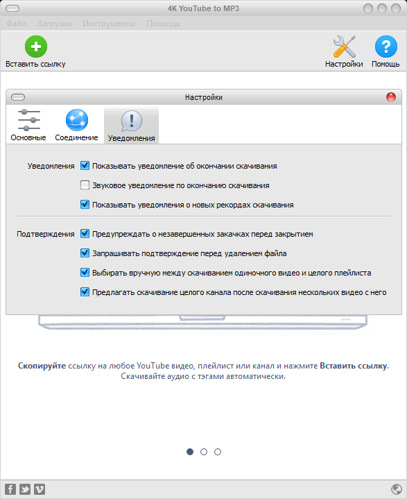 Не требуется (инсталлятор уже пролечен)4K YouTube to MP3 — приложение, которое позволяет скачивать аудио с YouTube, Vimeo, Facebook и сохранять его в MP3, M4A, OGG. Никаких сложных настроек, ничего лишнего, только загрузка аудио! Загрузка проста и приятна, просто скопируйте ссылку из браузера и нажмите "Вставить Url"