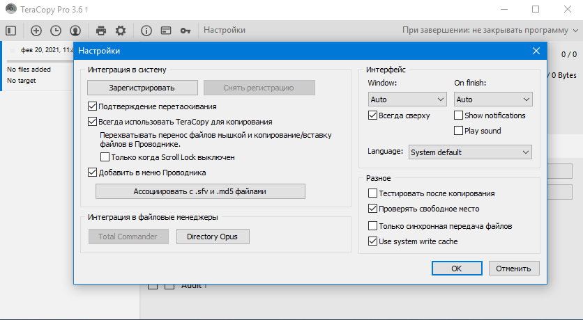 Особенности:Основным преимуществом TeraCopy является то, что она действительно быстрее копирует данные за счет многопоточного алгоритма. Также программа позволяет избежать проблем из-за отмены переноса на середине процесса, когда половина фалов оказывается в одной папке, а половина в другой. Если какой-либо файл невозможно скопировать, программа несколько раз повторяет попытку, после чего пропускает проблемный файл, а не обрывает весь процесс копирования, как это делает проводник.