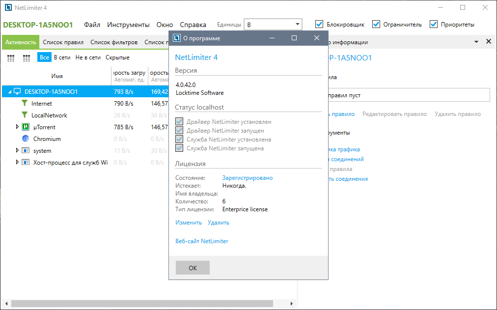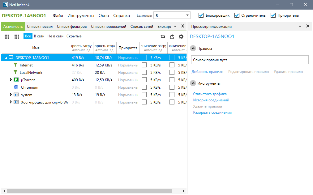Присутствует . Готовый серийникNetLimiter — утилита, которая позволяет собирать статистику об интернет-трафике, создаваемом любыми программами, а также контролировать трафик: Netlimiter позволяет выставлять ограничения на скорости скачивания/закачки для каждого приложения или соединения, осуществлять мониторинг их сетевой активности.Программа ведет детальную статистику в реальном времени, а при желании - за указанный промежуток времени.
