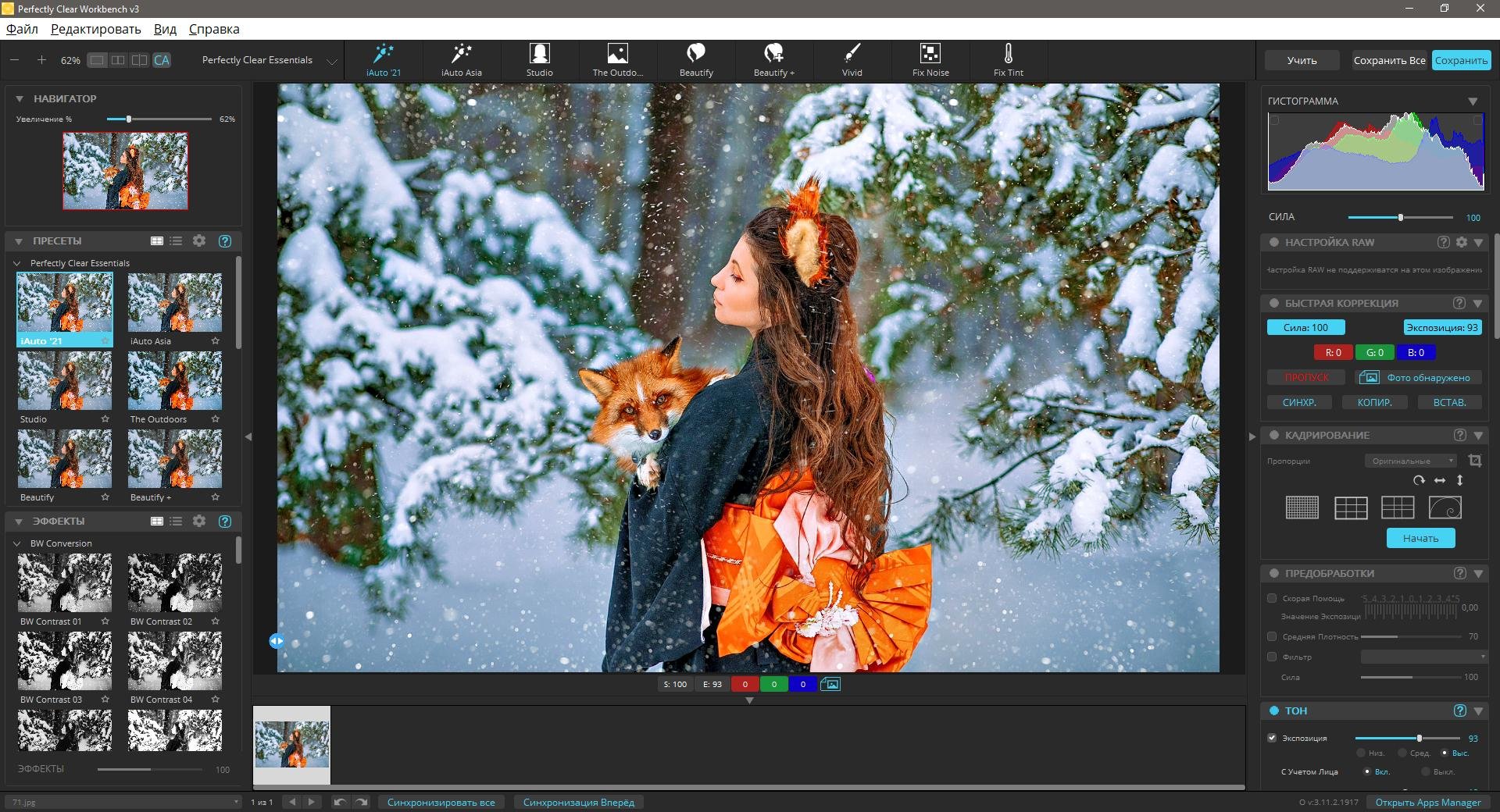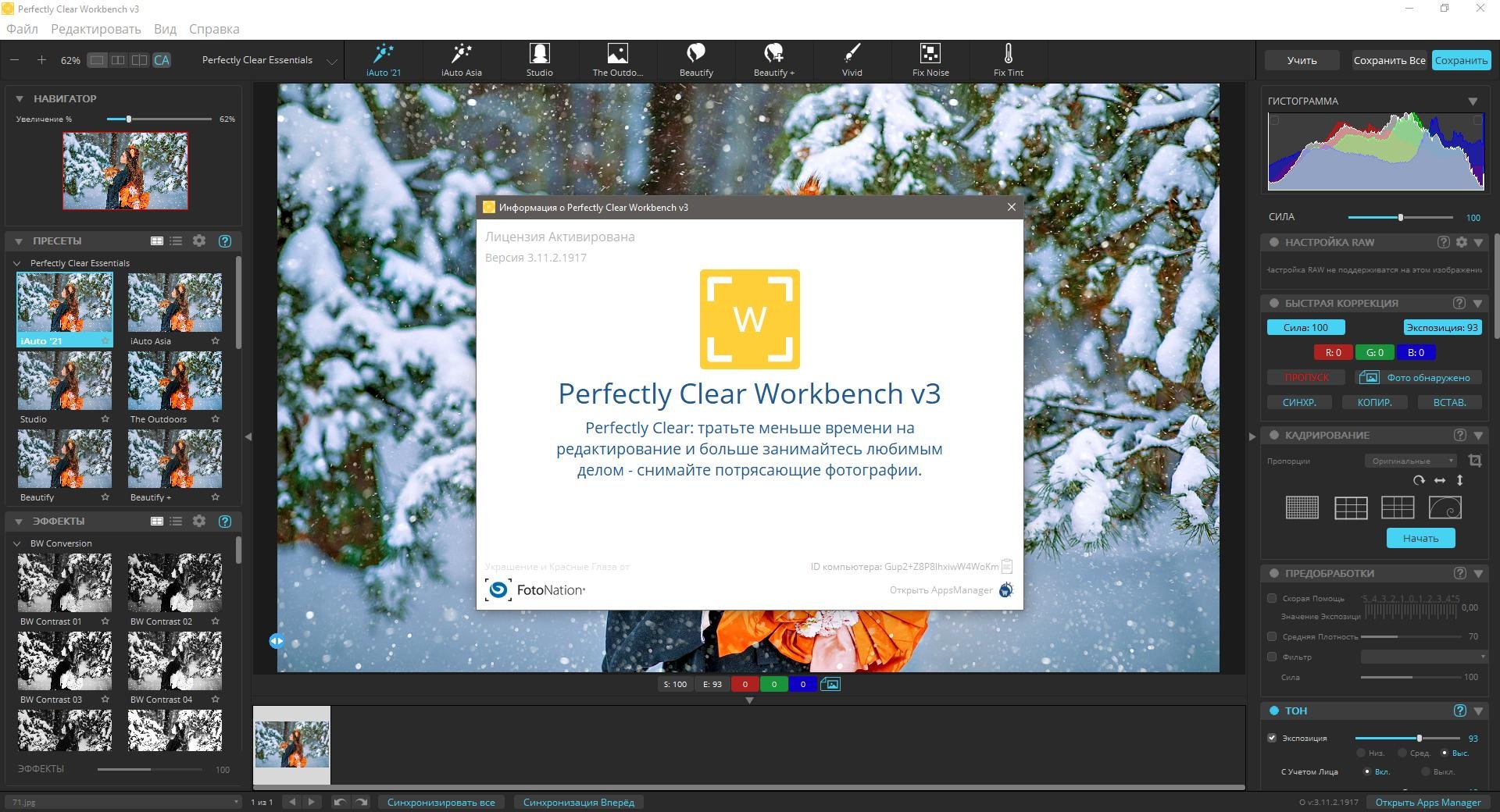 Не требуется (инсталлятор уже пролечен)Athentech Perfectly Clear WorkBench позволяет всего за пару кликов мыши откорректировать фотографии до совершенного вида в автоматическом режиме, а также исправлять их в ручном режиме.Традиционные методы исправления изображений не всегда приводят к желаемому результату. Данный продукт заслуживает вашего внимания, чтобы доверить ему автокоррекцию своих фото с бесценными воспоминаниями. Perfectly Clear даст вам возможность мгновенно довести фотографию до совершенства. Просто запустите плагин и выбранные фотографии будут автоматически исправлены.В цифровых камерах есть более десятка ограничений, которые приводят к таким нежелательным искажениям в фотографиях как: засветка, затемненность, нехватка насыщенности и глубины цвета, плохой тон кожи, размытость, "красные глаза", шумы и т. д. Плагин Perfectly Clear исправит эти дефекты в автоматическом или ручном режимах с применением собственной фирменной технологии, в которой применены более 10 запатентованных корректировок и 10 лет научных исследований.