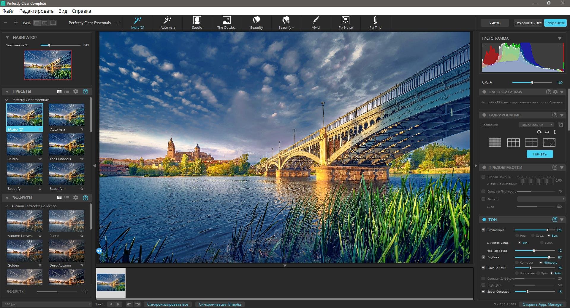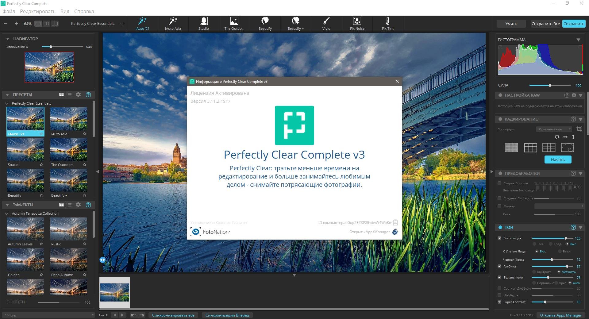 Не требуется (инсталлятор уже пролечен)Описание: Приложение Athentech Perfectly Clear Complete может работать отдельно или как плагин для Photoshop и Lightroom. Позволяет всего за пару кликов мыши откорректировать фотографии до совершенного вида в автоматическом режиме, а также исправлять их в ручном режиме.Традиционные методы исправления изображений не всегда приводят к желаемому результату. Данный продукт заслуживает вашего внимания, чтобы доверить ему автокоррекцию своих фото с бесценными воспоминаниями. Perfectly Clear даст вам возможность мгновенно довести фотографию до совершенства. Просто запустите плагин и выбранные фотографии будут автоматически исправлены.В цифровых камерах есть более десятка ограничений, которые приводят к таким нежелательным искажениям в фотографиях как: засветка, затемненность, нехватка насыщенности и глубины цвета, плохой тон кожи, размытость, "красные глаза", шумы и т. д. Плагин Perfectly Clear исправит эти дефекты в автоматическом или ручном режимах с применением собственной фирменной технологии, в которой применены более 10 запатентованных корректировок и 10 лет научных исследований.