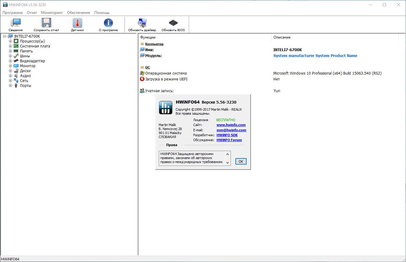 Инструмент поставляется без установочного файла, что делает HWiNFO32/64 портативной программой. Вы можете разместить исполняемый файл в любой части диска и просто нажать по нему для запуска программы. HWiNFO32/64 можно сохранить на переносной USB-накопитель или схожее устройство хранения для того, чтобы беспрепятственно запускать программу на любых компьютерах. Кроме того, инструмент не создает новых записей в реестре Windows и меню Пуск.