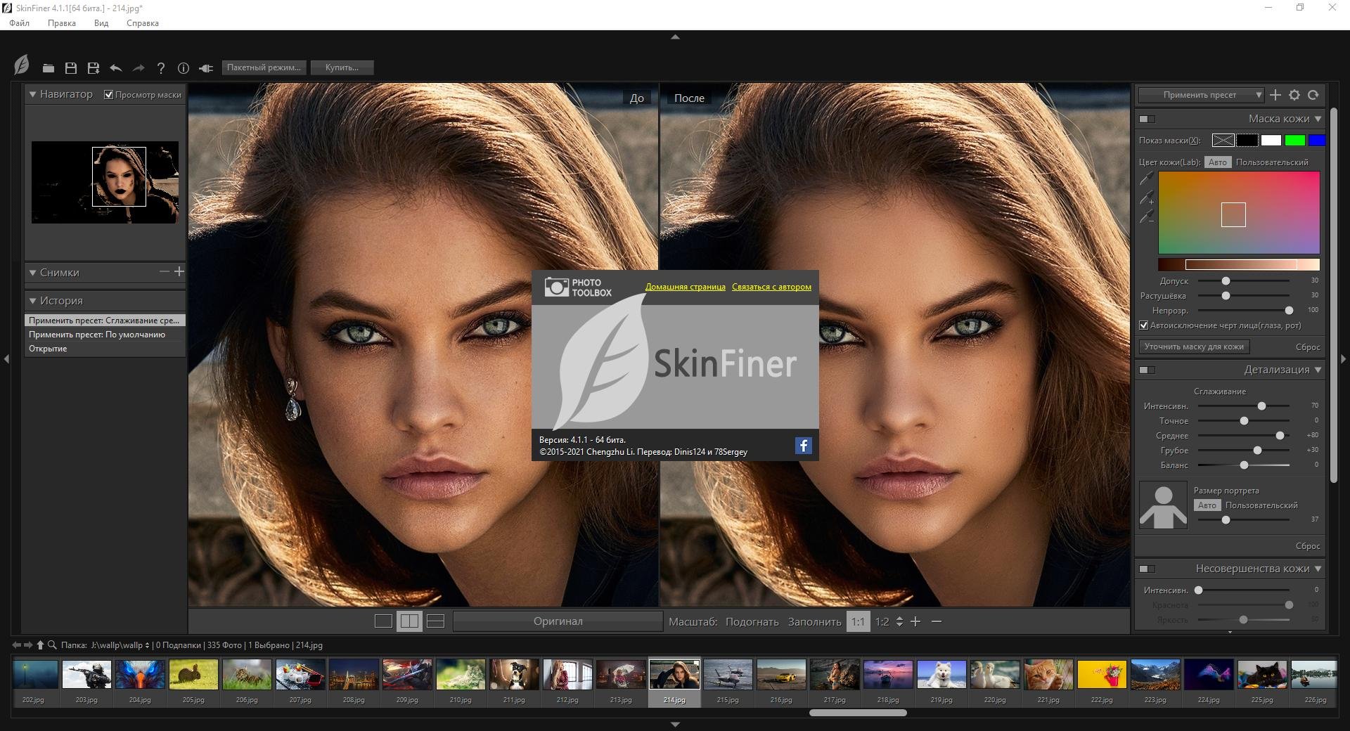 Не требуется (инсталлятор уже пролечен)SkinFiner - программа для редактирования фотографий, которая избавит вас от утомительного ручного труда по ретуши кожи. Она помогает разглаживать и улучшать кожу самым простым и быстрым способом.