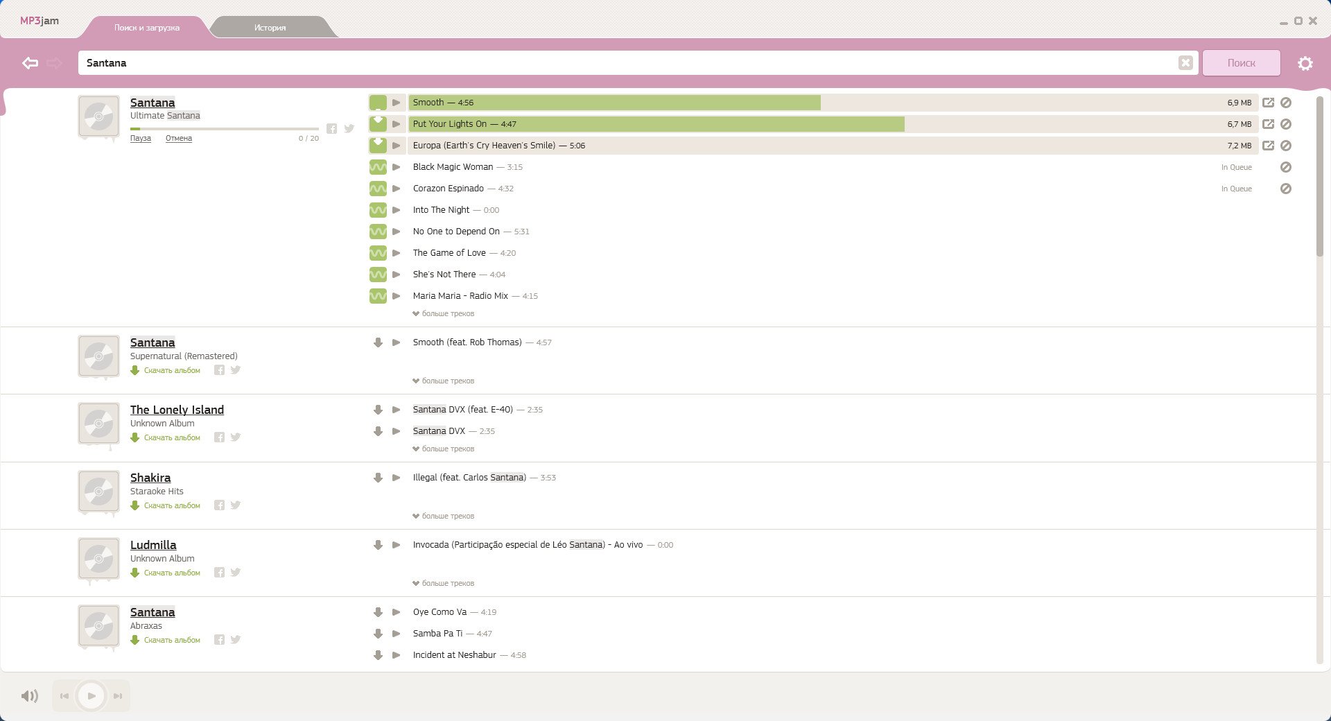 Не требуется (инсталлятор уже пролечен)MP3jam - это программа, с помощью которой вы сможете искать и загружать любые аудио файлы совершенно бесплатно! Достаточно в поиске задать название любимой песни, исполнителя или название альбома, как перед вами предстанут все возможные варианты. Дальше останется нажать всего лишь на одну кнопку, чтобы начать загрузку любимых песен. Имеется возможность предварительного прослушивания найденных аудио композиций. Также MP3jam предоставляет возможность скачивать музыкальные композиции напрямую с сайта YouTube. Достаточно только скопировать URL c YouTube и вставить в поисковую строку MP3jam. Вы сможете останавливать загрузки и продолжать их с места разъединения. Большая часть аудио файлов доступна в очень хорошем качестве.
