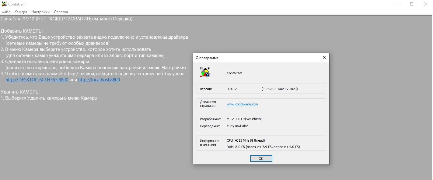 Не требуетсяContaCam – невероятно простая и бесплатная программа, предлагающая пользователям систему видео наблюдения StreetThis Video Surveillance, а также возможность вести запись с любой подключенной камеры к компьютеру, например позволит записывать в реальном времени с обычной веб-камеры в Windows.Один из режимов позволяет делать запись в виде миниатюр, после обнаружения движения, которая будет наиболее интересна для экономии места на дисках. Кроме того, программа сможет отправлять такие миниатюры по FTP протоколу или на электропочту, используя SSL / TLS или STARTTLS.