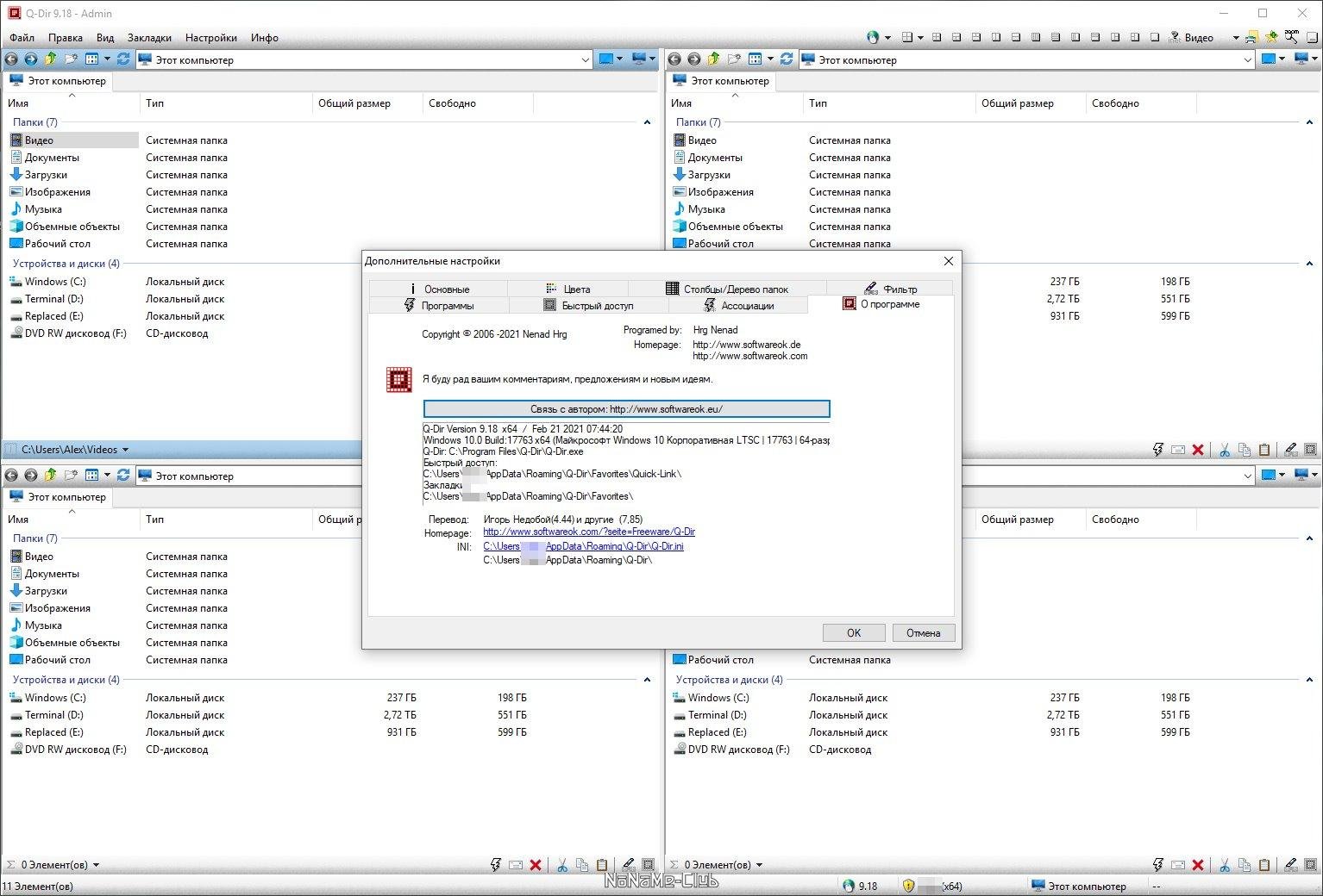 Не требуетсяQ-Dir - файловый менеджер с оригинальным четырехпанельным интерфейсом и широкими возможностями по работе с файлами. Работает с любого съемного устройства. Многоязычный интерфейс.Позволяет получать быстрый доступ к часто используемым папкам с помощью ссылок "Quick-Link's", поддерживает функцию drag&drop, работает с буфером обмена, поддерживает следующие типы папок: ZIP, FTP, сетевые, системные, ярлыки. Позволяет просматривать изображения, имеет встроенную "лупу". Может выделять в проводнике цветом различные типы файлов, фильтровать файлы и многое другое. Возможность экспорта в XLS, CSV, TXT, HTML. Имеет специальный режим предварительного просмотра файлов.