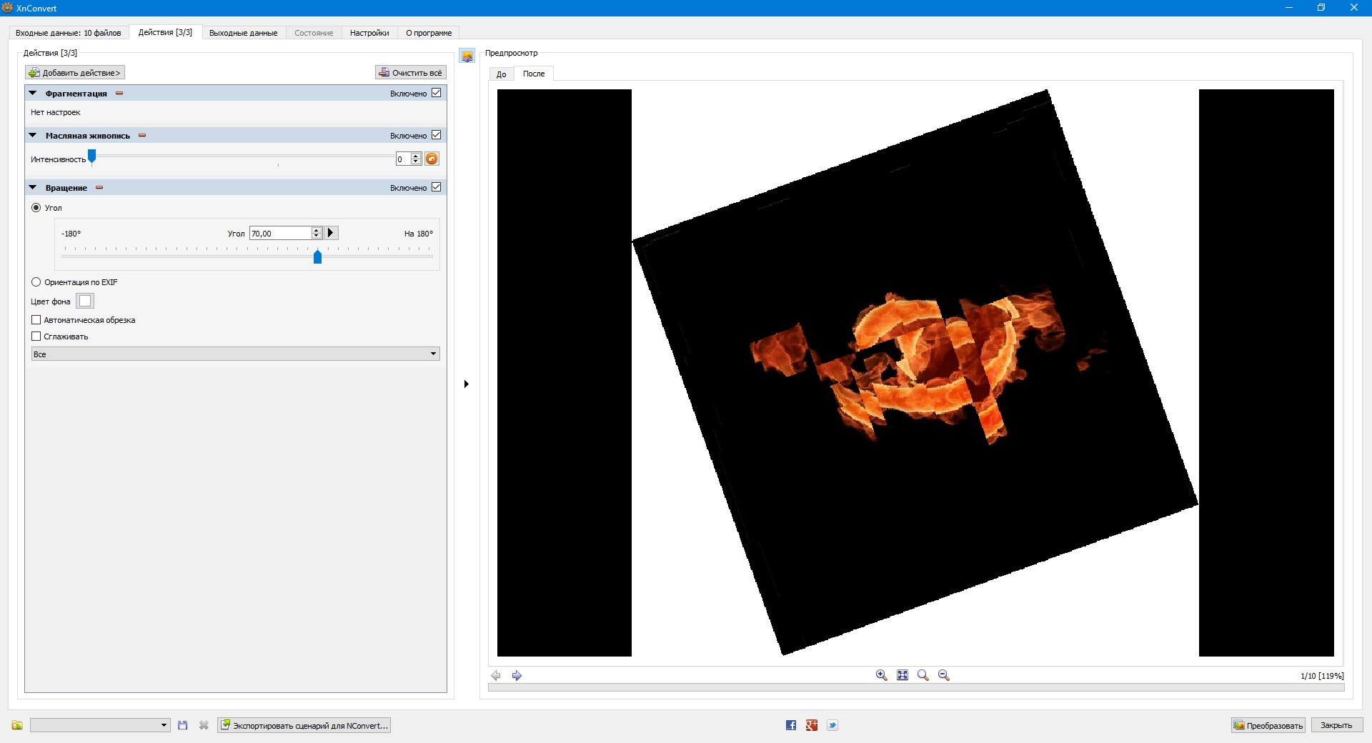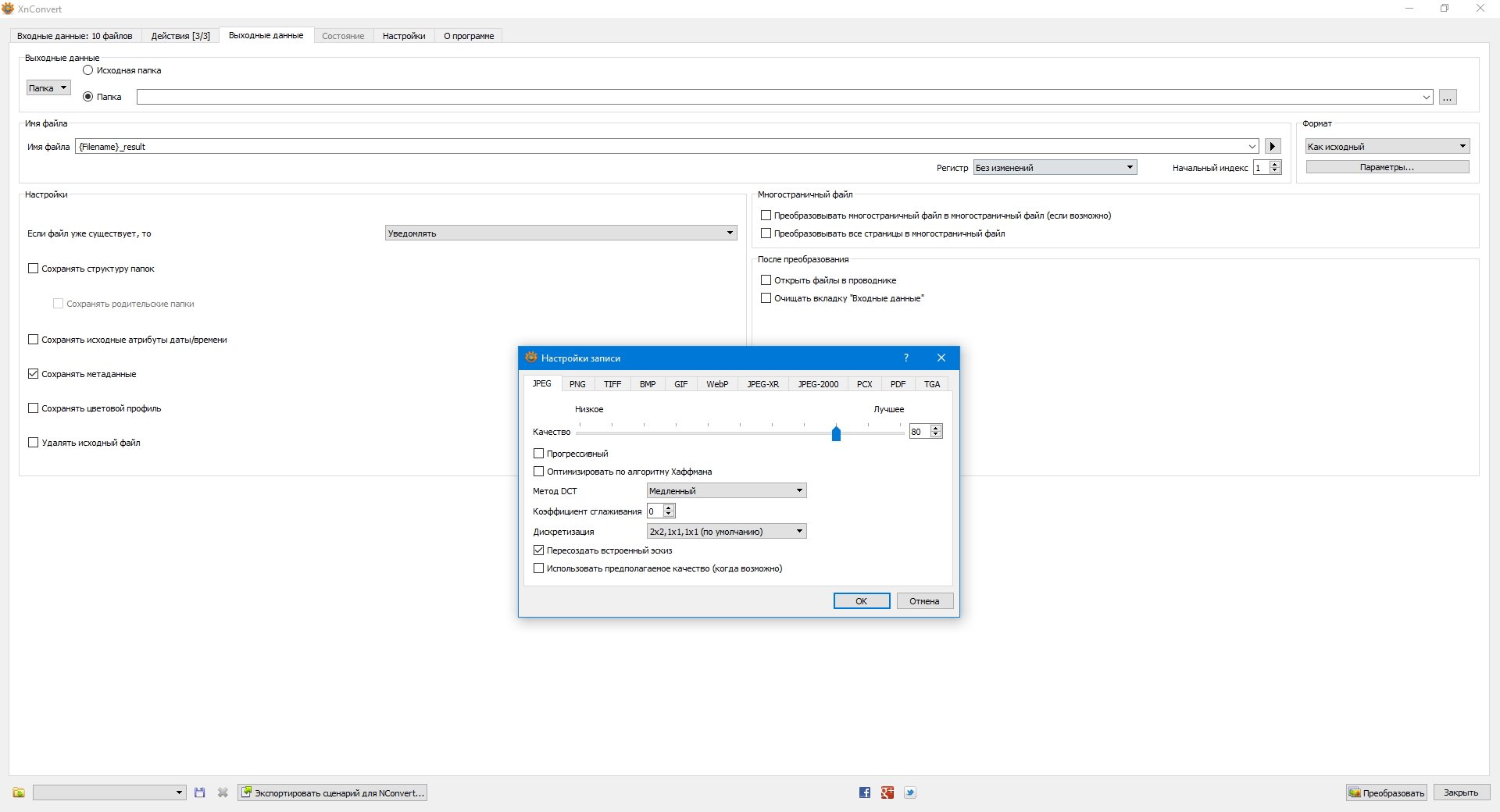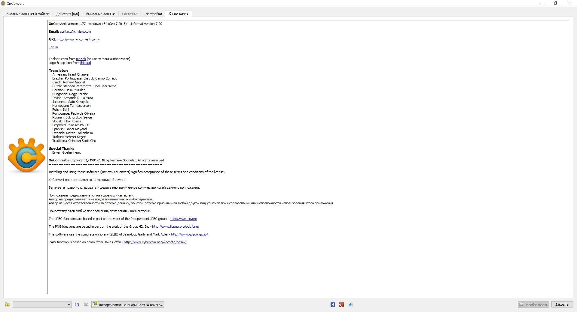 Не требуетсяXnConvert - бесплатная кроссплатформенная утилита для конвертации и обработки цифровых изображений и снимков.Программа позволяет пользователю работать более с чем 500 графических форматов, включая JPEG, TIFF, PNG, GIF, RAW-форматы, WebP, OpenEXR, а также осуществлять регулировку яркости, контрастности и гаммы изображений, изменять размер, применять фильтры и разнообразные спецэффекты, добавлять водяные знаки и заниматься ретушированием фотографий и многое другое.XnConvert ведет журнал, предоставляющий подробную информацию обо всех недавних операциях по обработке изображений.