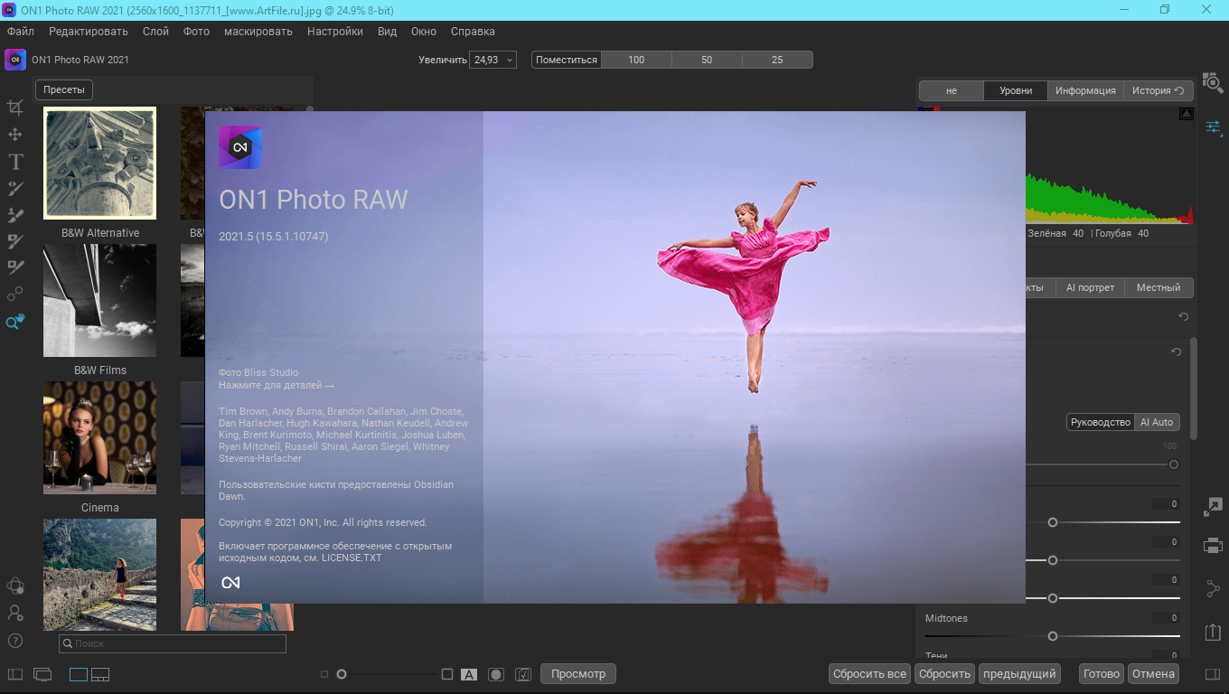 В комплекте (замена файловON1 Photo RAW 2021 включает в себя ключевые обновления для быстрого недеструктивного механизма обработки снимков в формате RAW. Теперь у фотографов появился инструмент с быстрым управлением фотографиями, точная обработка фотографий, сотни настраиваемых фотоэффектов, удобная и красивая склейка HDR, панорамы, маскировка и корректировки смешивания, работа со слоями и многое другое – и всё это в одном приложении.Редактор ON1 Photo RAW предназначен не только для RAW файлов, поддерживаются форматы файлов: JPEG, TIF, PSD, PSB, PNG и DNG при обработке которых можно использовать всю мощь и обилие инструментов редактирования в приложении. ON1 Photo RAW можно также без проблем внедрить в текущие рабочие процессы – приложение интегрируется как плагин для Adobe® Lightroom® и Photoshop®, наряду с тем, что может выступать в виде полного автономного редактора фотографий. Версия 2021 также интегрируется с основными облачными сервисами, позволяющими загружать, управлять и редактировать фотографии на нескольких компьютерах. Это также позволяет пользователям синхронизировать фотографии и их изменения на нескольких компьютерах или в студии.