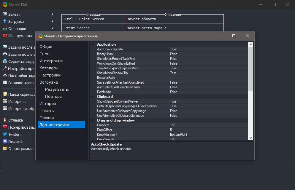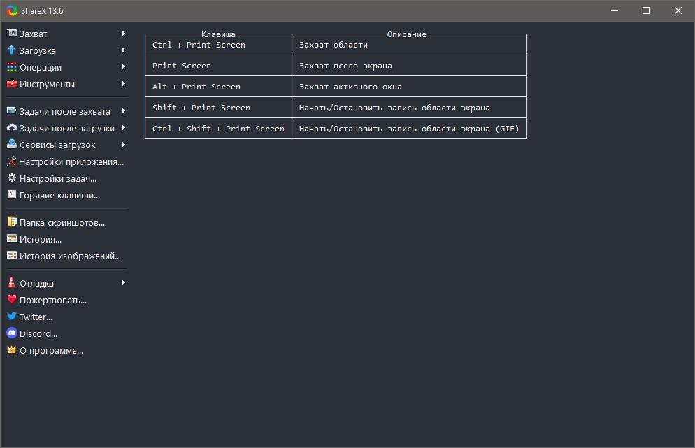 Не требуетсяShareX - программа для снятия снимков и видеозахвата экрана. Утилита скрывает в себе кучу функций, она умеет создавать как скриншоты всего экрана, так и снимки выделенных областей экрана, причем помимо традиционной прямоугольной области можно выделять и различные геометрические фигуры, в том числе и произвольной формы. После создания снимка Вы можете задать ряд операций, которые будут автоматически проделаны с ним: изменить размер, добавить рамку, тень, водяной знак или текстовую аннотацию к изображению, сохранить файл в указанную папку, либо отправить его в сервис для хранения изображений или файлов и тут же получить на него готовую ссылку, чтобы поделиться им с другими пользователями интернета.