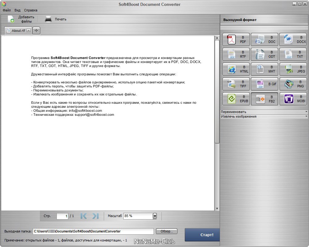 Конвертируйте файлы между форматами PDF, DOC, DOCX, RTF, TXT, ODT, HTML, JPEG, TIFF и другими.