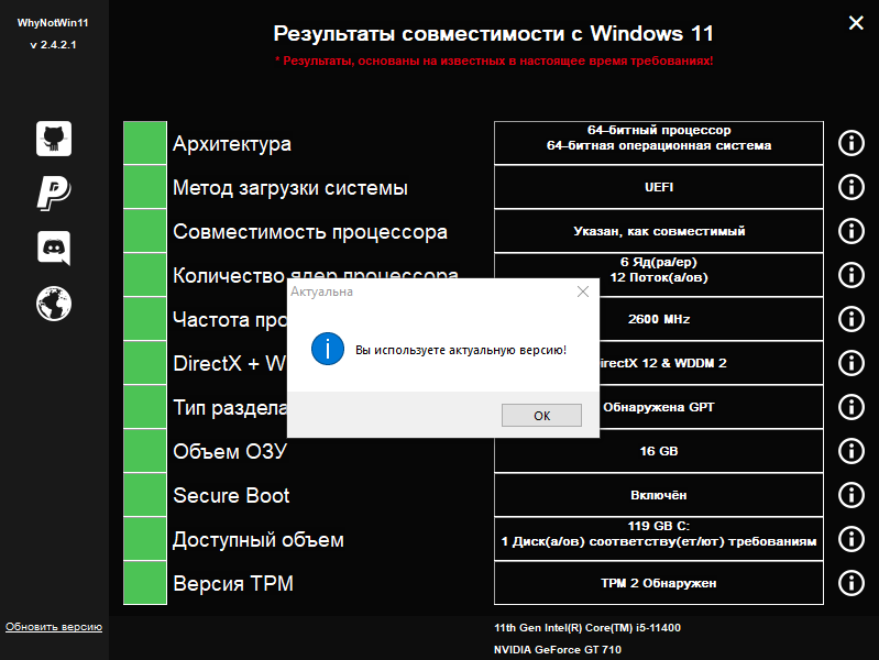 Не требуетсяОписание: Утилита WhyNotWin11 предоставляет информацию о том, совместим ли ваш компьютер и встроенные аппаратные компоненты с Windows 11